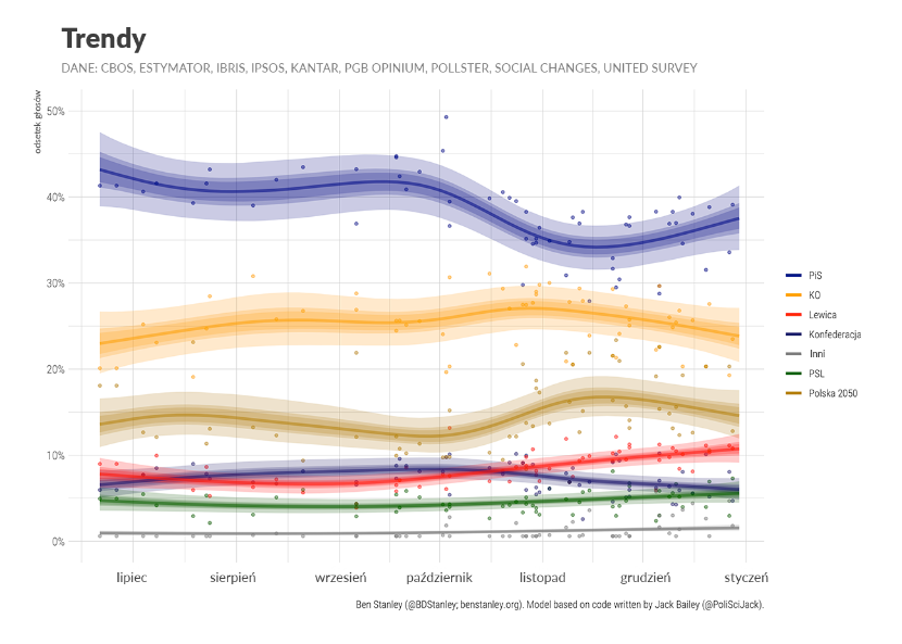 Można to przypisać lepszym niż spodziewane wynikom innych partii opozycji. Sympatia dla Polski 2050 jest bardziej zmienna niż dla innych ugrupowań, ale można założyć, że głos na formację Hołowni chciałoby oddać blisko 15 proc. Polaków, czyli 2–3 pkt proc. więcej niż wczesną jesienią. Lewica także zanotowała wzrosty w ostatnich miesiącach, przeskakując z 7 proc. poparcia na 11 proc.