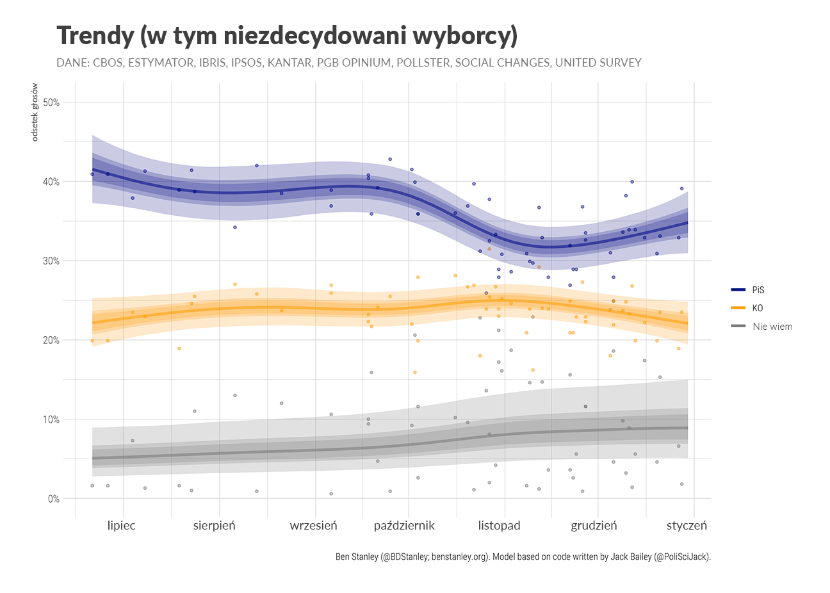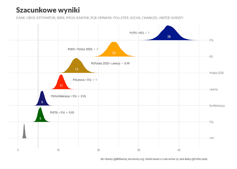 Ben Stanley – brytyjski politolog mieszkający w Polsce, profesor Uniwersytetu SWPS. Przy wyliczeniach szacowanego poparcia dla partii politycznych używa modelu statystycznego, którego prekursorem był amerykańsko-australijski politolog prof. Simon Jackman. Pod uwagę wziął sondaże CBOS, Estymator, IBRiS, IBSP, Indicator, Ipsos, Kantar, Pollster, Social Changes, United Surveys.