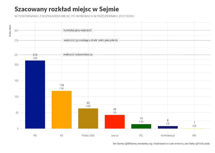 PiS mógłby liczyć na 194–238 mandatów, co dawałoby mu ledwie 9-proc. szansę na samodzielne rządy. Najbardziej prawdopodobnym wynikiem jest 213, co pozwoliłoby najwyżej na koalicję z PSL (14 posłów) i Konfederacją (8 posłów), choć oba ugrupowania są na granicy progu wyborczego i niewielkie zmiany mogłyby sprawić, że znalazłyby się pod nim.