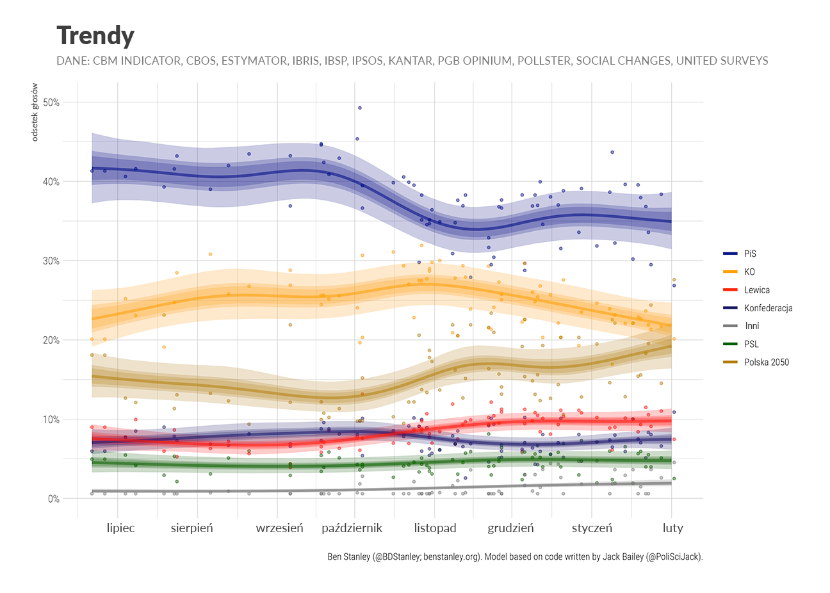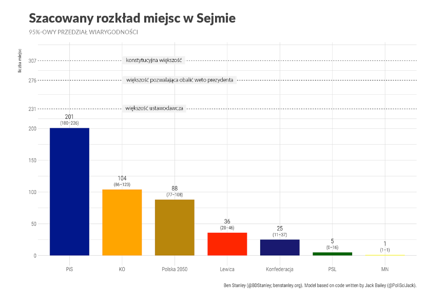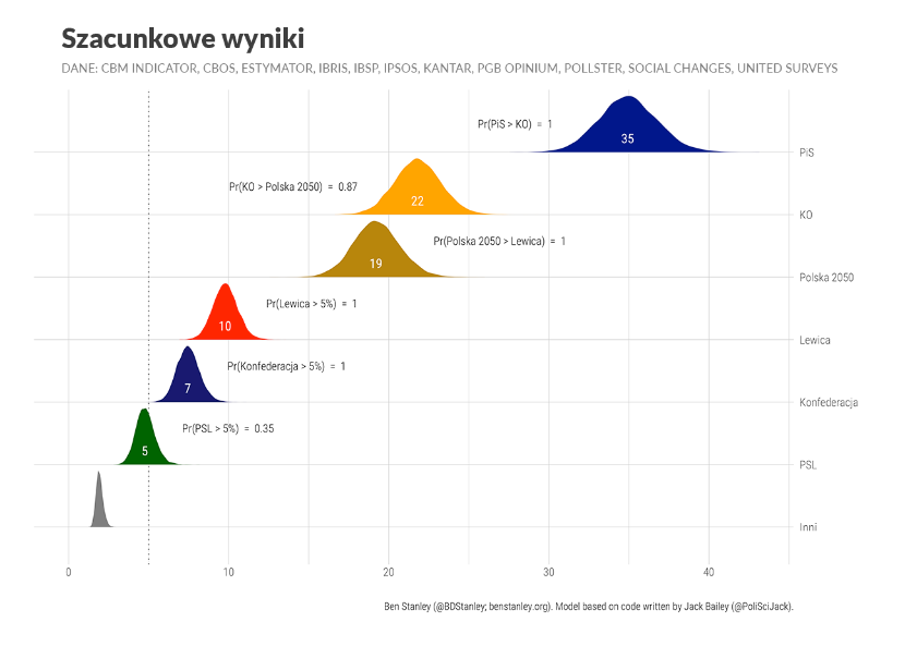 Ben Stanley – brytyjski politolog mieszkający w Polsce, profesor Uniwersytetu SWPS. Przy wyliczeniach szacowanego poparcia dla partii politycznych używa modelu statystycznego, którego prekursorem był amerykańsko-australijski politolog prof. Simon Jackman. Pod uwagę wziął sondaże CBOS, Estymator, IBRiS, IBSP, Indicator, Ipsos, Kantar, Pollster, Social Changes, United Surveys.
