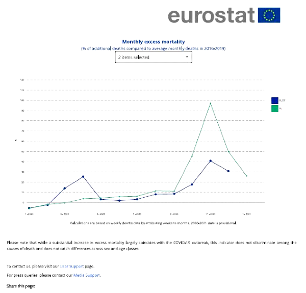 Po co ta operacja? Odpowiedź można wyczytać z tego wykresu. Ilustracja na podstawie danych Eurostatu pokazuje, czego boi się premier i od czego chce odwrócić uwagę opinii publicznej. Wykres dotyczy tzw. ponadnormatywnych śmierci w zeszłym roku. Chodzi o liczbę zgonów większych niż średnia z kilku ostatnich lat (2016–19).