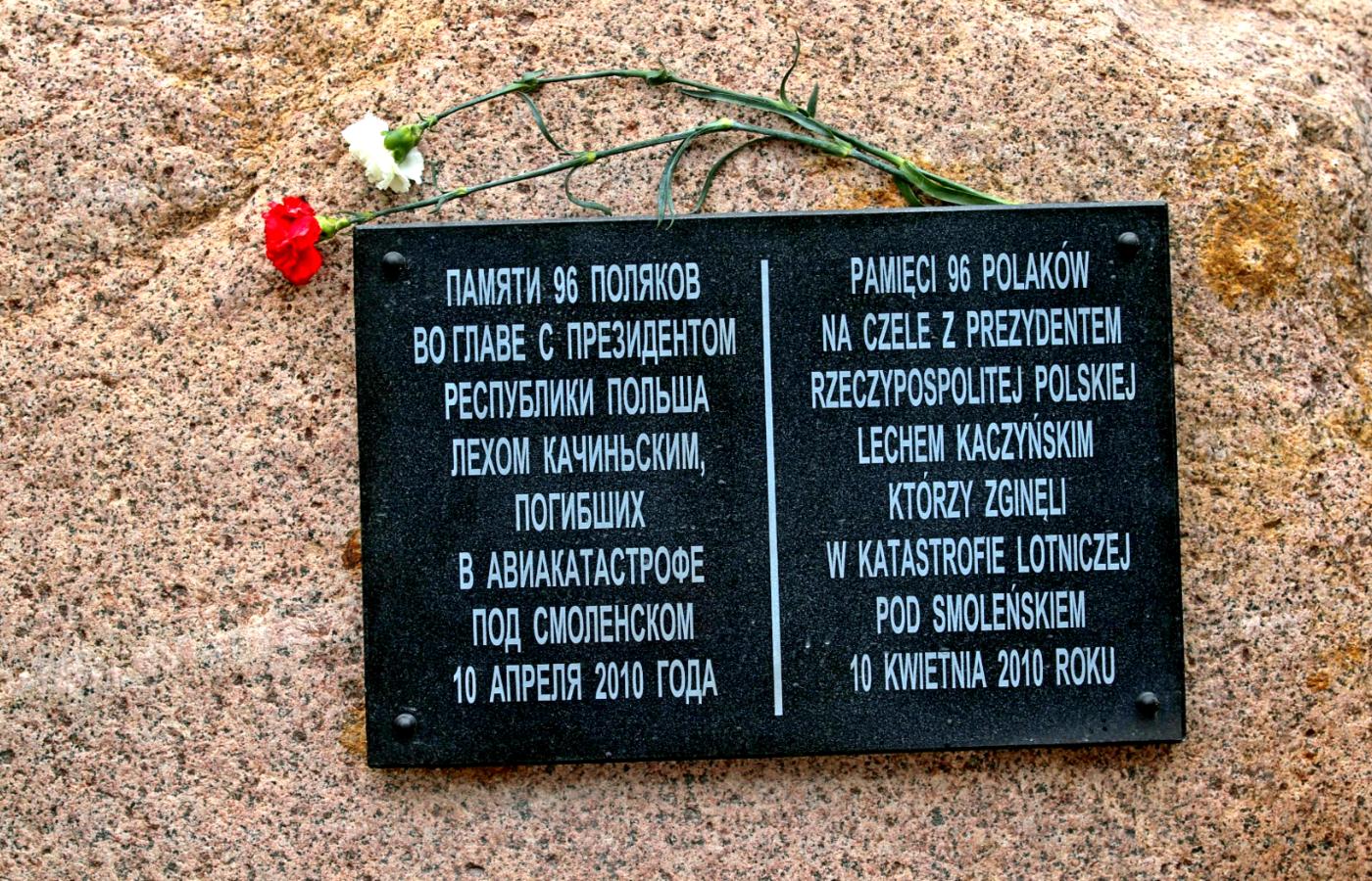 „Pamięci 96 Polaków na czele z prezydentem Rzeczypospolitej Polskiej Lechem Kaczyńskim, którzy zginęli w katastrofie lotniczej pod Smoleńskiem 10 kwietnia 2010 r.” – taki dwujęzyczny napis widnieje na tablicy umieszczonej na polnym kamieniu, który stoi na miejscu katastrofy. Umieścili ją Rosjanie dzień przed pierwszą rocznicą wypadku.