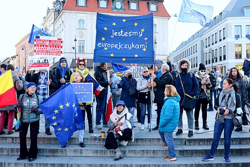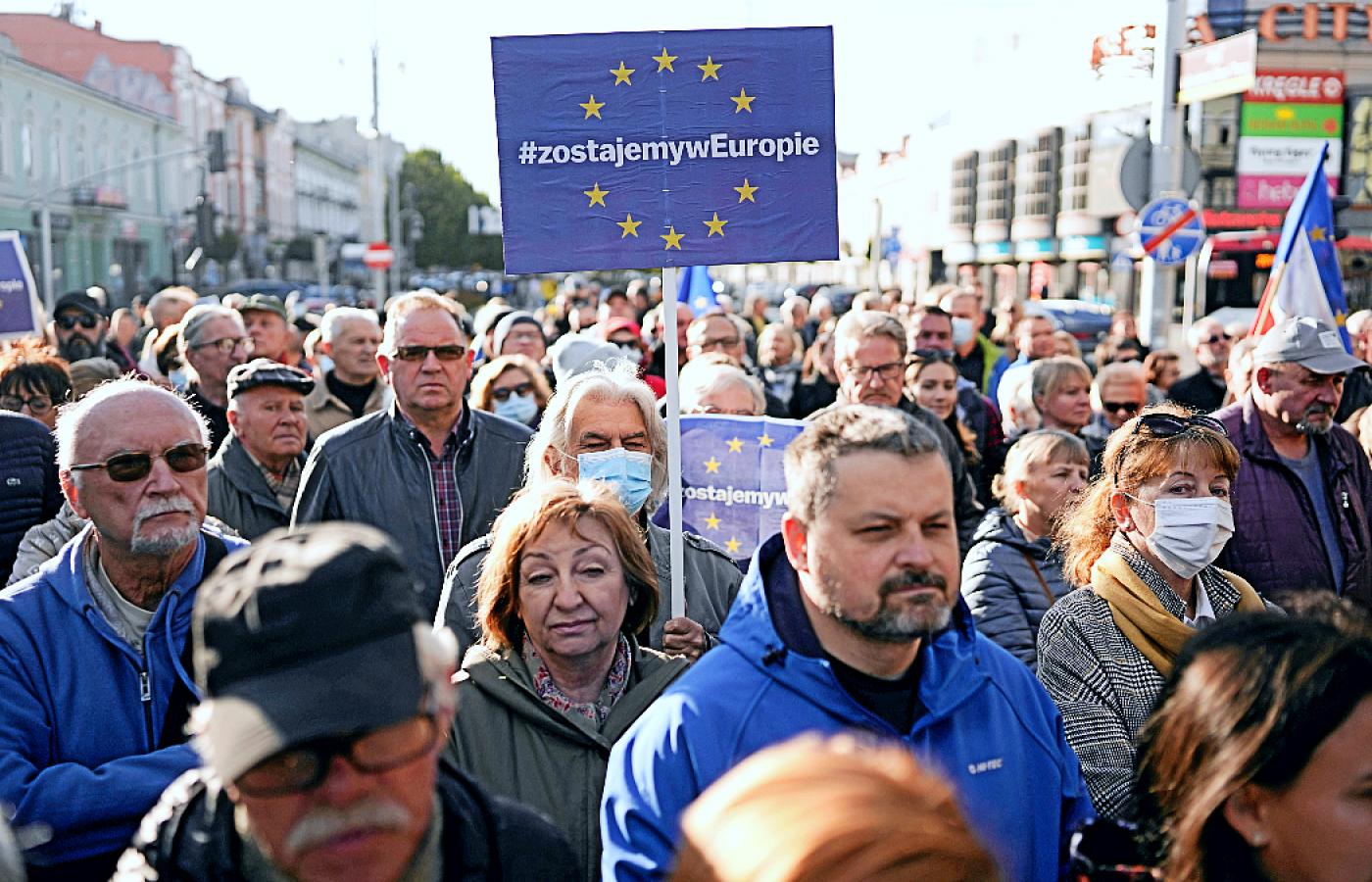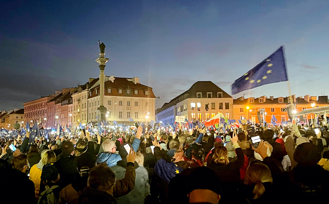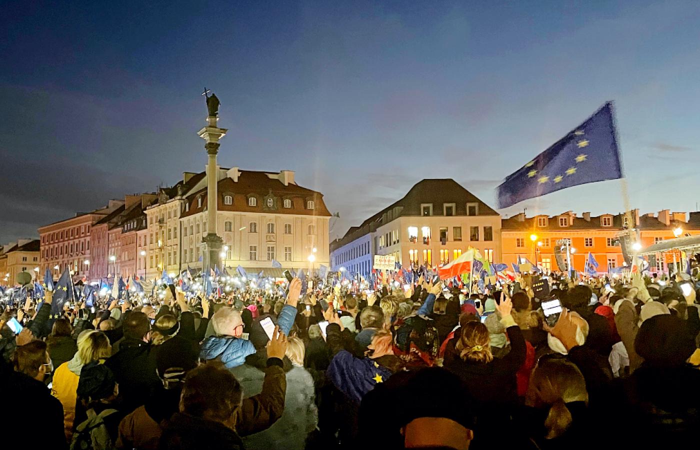 „Mówiłem, że jak będzie trzeba, to stanę tu nawet sam. Ale nie przyszło mi do głowy, że aż tylu was tu przyjdzie” – rzucił ze sceny. Jego słowa dotarły do dziesiątek tysięcy osób (według szacunków miasta – 80–100 tys.). Prośbę o choć minimalne trzymanie dystansu potraktowano z rozbawieniem. Bo nie dla wszystkich wystarczyło miejsca na obszernym placu, ludzie tłoczyli się więc na ciasnych kamiennych ulicach wśród dziesiątek radiowozów migających na niebiesko, jakby pod kolor unijnych emblematów i flag. W tym samym czasie Nowym Światem zmierzały kolejne osoby. W rękach trzymały flagi, zwykle unijne, ale też biało-czerwone. Były też transparenty. Jak ten: „Europa to nasz dom, zostajemy, a PiS won”. Albo: „Wyjście z Unii tylko przez Terespol”. Niektóre transparenty, stylizowane na unijne flagi, parafrazowały antypisowskie hasło skrywane pod ośmioma gwiazdami.