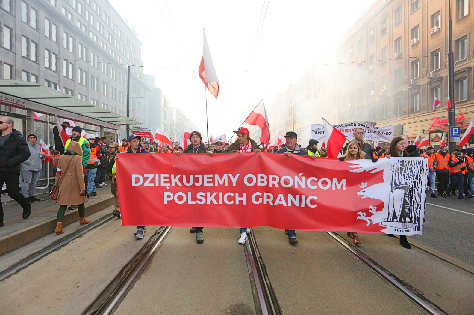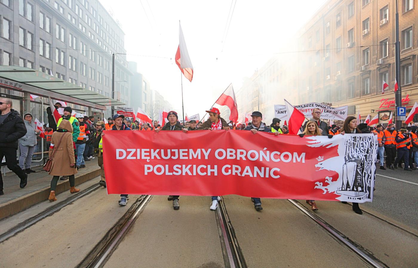 Marsz Niepodległości – pod hasłem „Niepodległość nie na sprzedaż” – ruszył z ronda Dmowskiego o godz. 13:50 (tłum zbierał się do 13), przeszedł Alejami Jerozolimskimi, obok ronda de Gaulle′a, przez most Poniatowskiego, skąd dotarł na błonia Stadionu Narodowego. To standardowa trasa tego pochodu (o tegorocznych zawirowaniach organizacyjnych – w dalszej części tekstu). Na transparentach było widać różne radykalne hasła: „To my, nacjonaliści”, „Śmierć wrogom ojczyzny”, „Folksdojcze i czerwona zaraza – won z Polski”. Ale i „Dziękujemy obrońcom polskich granic”, nawiązujące do sytuacji na wschodzie kraju. W centrum stolicy przez cały dzień było szaro, dymiło się od rac, wybuchały petardy. Uczestnicy odpuścili też sobie maseczki (ostatniej doby potwierdzono 19 tys. zakażeń koronawirusem – najwięcej od kwietnia).