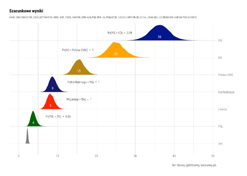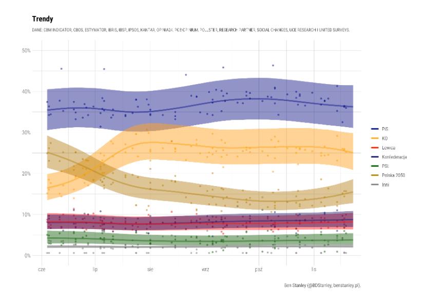 Wykres trendów potwierdza, że jeśli wziąć pod uwagę tylko zdecydowanych wyborców, poparcie dla PiS ostatnio spadło, ale nie w sposób dramatyczny. Najbardziej prawdopodobny poziom poparcia dla tej partii wynosi obecnie 36 proc., podczas gdy na początku października to było 38 proc. Nawet jeśli oblicza się trendy bez wyników Social Changes, udział PiS w puli obniża się tylko o 1 pkt. proc., a trend spadkowy nie staje się dużo gwałtowniejszy. Sugeruje to, że najnowszy sondaż Social Changes jest zapewne odchyleniem od normy, ale nawet bez niego poparcie dla PiS spada raczej stopniowo.