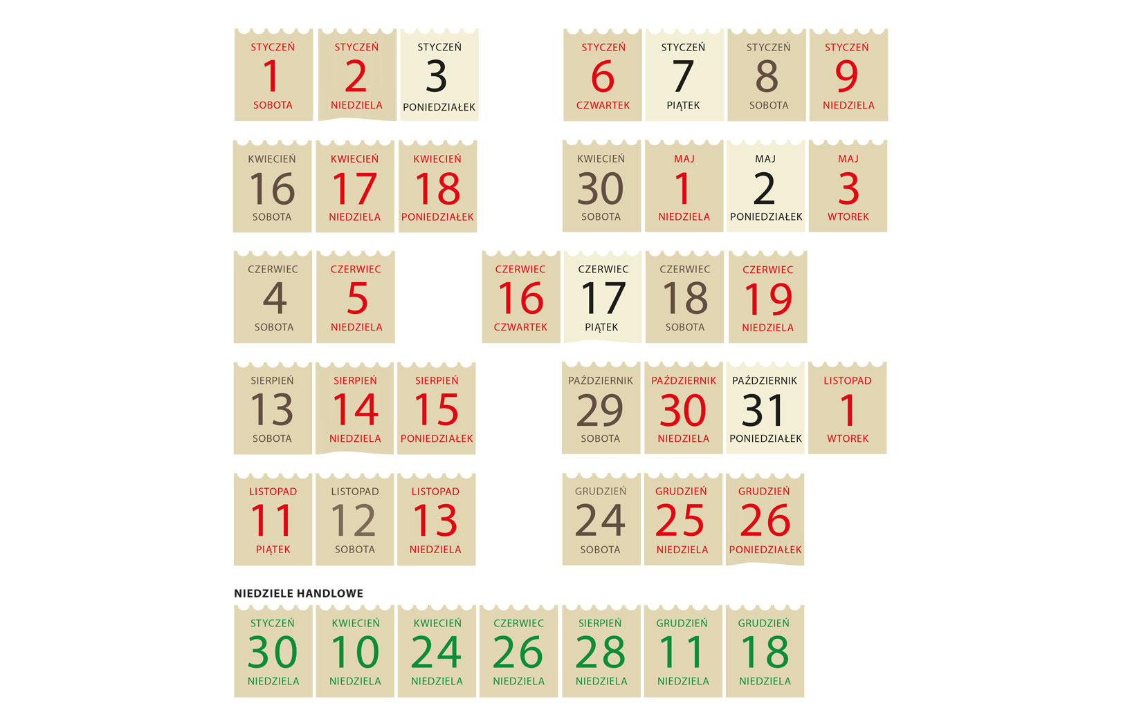 1 stycznia wypada w sobotę, więc noworoczny weekend nie będzie długi – chyba że dogadamy się z pracodawcą i w poniedziałek, 3 stycznia odbierzemy przysługujący nam ustawowy dzień wolnego za święto wypadające w sobotę. Szansa na pierwszy most pojawi się kilka dni później – Święto Trzech Króli wypada bowiem w czwartek. Następne wolne będziemy mieć dopiero w drugiej połowie kwietnia: Wielkanoc i lany poniedziałek w tym roku wypadają 17 i 18 kwietnia. Wkrótce potem szykuje się długi majowy weekend: co prawda Święto Pracy obchodzić będziemy w niedzielę, ale dobierając wolny poniedziałek, możemy stworzyć most między przypadającym na wtorek Świętem Narodowym Trzeciego Maja. Tradycyjnie Zielone Świątki są w niedzielę (w tym roku: 5 czerwca), a Boże Ciało w czwartek (16 czerwca) – i tu znów poprzez most można stworzyć czterodniowy weekend. Następny długi weekend trafi się w sierpniu – Wniebowzięcie (15 sierpnia) wypada bowiem w poniedziałek. Także w listopadzie będzie szansa na dłuższy odpoczynek: i z okazji Wszystkich Świętych, bo 1 listopada to wtorek, więc wystarczy tylko wziąć wolny poniedziałek, i z okazji Święta Niepodległości, które w tym roku jest w piątek. Natomiast pierwszy i drugi dzień Bożego Narodzenia to niedziela i poniedziałek.