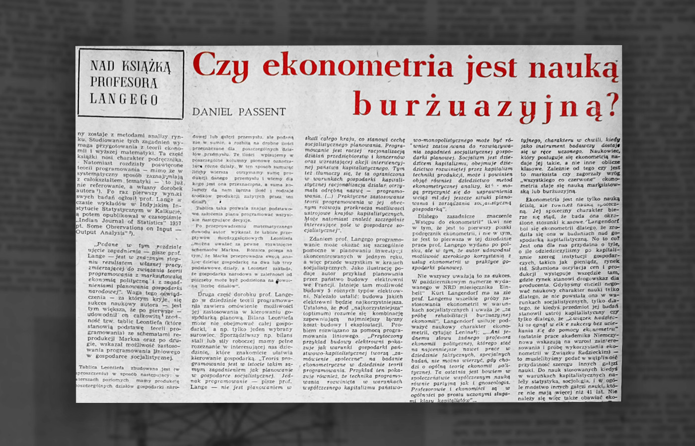 Nie wszyscy uważają to za sukces. W październikowym numerze wydawanego w NRD miesięcznika „Einheit” Kurt Langendorf ma za złe prof. Langemu wszelkie próby zastosowania ekonometrii w warunkach socjalistycznych i uważa je „za próbę rehabilitacji burżuazyjnej ekonomii”. Langendorf usiłuje podważyć naukowy charakter ekonometrii, cytując Lenina: „Ani jednemu słowu żadnego profesora ekonomii politycznej, którego stać na najcenniejsze nawet prace w dziedzinie faktycznych, specjalnych badań, nie można wierzyć, gdy chodzi o ogólną teorię ekonomii politycznej. Ta ostatnia jest bowiem w społeczeństwie współczesnym nauką równie partyjną, jak i gnoseologia. Profesorowie i ekonomiści są w ogólności po prostu uczonymi sługami klasy kapitalistów”…