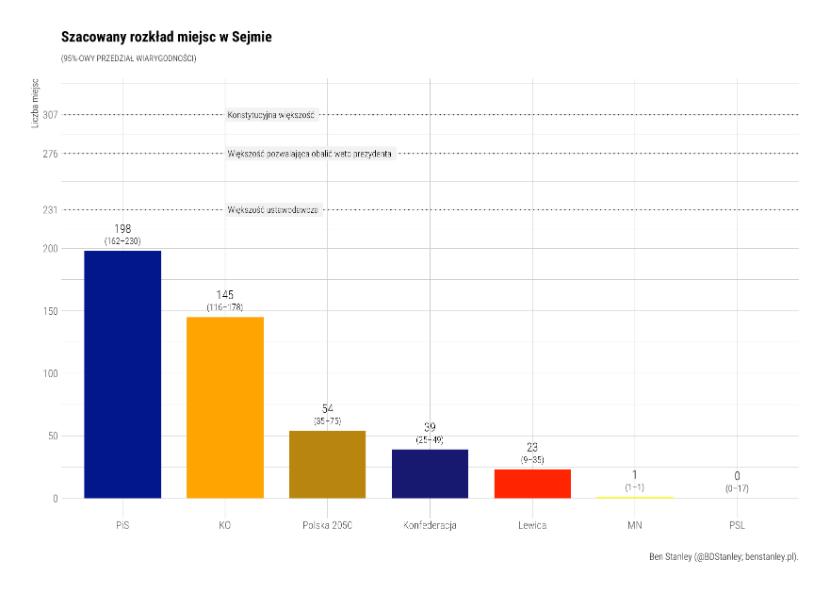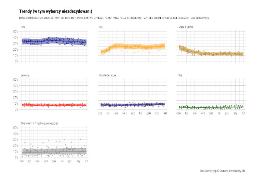 Wśród innych partii Konfederacja (10 proc.) wydaje się wyprzedzać Lewicę (7 proc.), z którą przez ostatnie miesiące rywalizowała o czwarte miejsce. Z drugiej strony zahamowany został wzrost notowań PSL. Istnieje szansa, że przy obecnych wynikach partia weszłaby do Sejmu, ale bardziej prawdopodobne jest, że znów spadnie poniżej progu 5 proc.