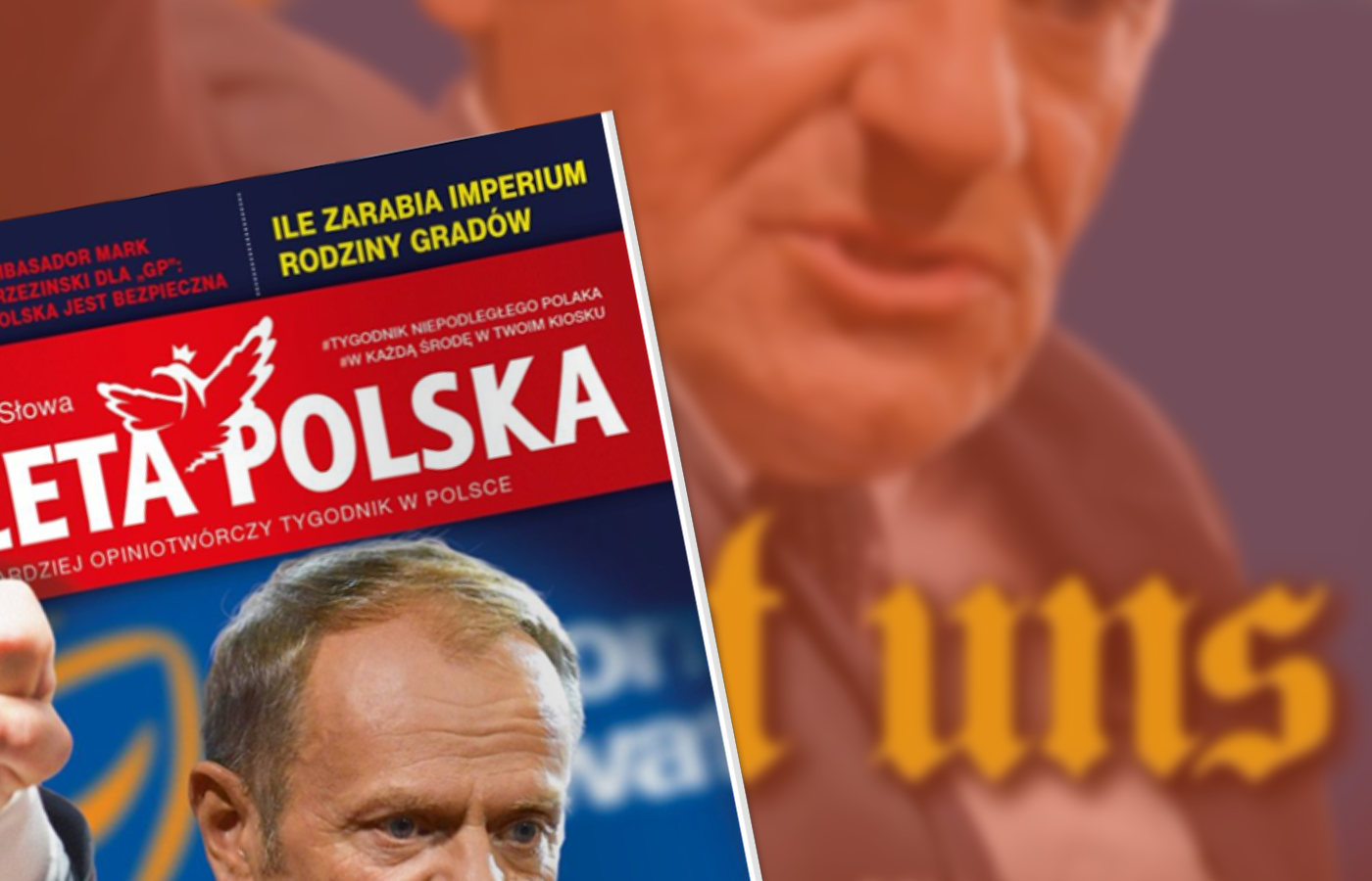 Ostatni numer „Gazety Polskiej” ma okładkę, która na pewno wejdzie do mrocznej historii polskiego dziennikarstwa. Widzimy oto na zdjęciu Donalda Tuska z wyciągniętą ręką i zwartą pięścią. Ten gest imitujący swoiście hitlerowskie heilowanie wzmocniony jest dobranym i podkręconym zdjęciem twarzy Tuska, groźnej, bojowej, z dodanym specjalnie cieniem pod nosem, coś na kształt wąsika Hitlera. Pod zdjęciem napis w szwabasze: „Gott mit uns”. Objaśnienie okładkowe brzmi: „Słowa Donalda Tuska: »Wierzysz w Boga, nie głosujesz na PiS«, to odpowiednik pruskiego »Gott mit uns«, obecnego na klamrach niemieckich pasów. Padły, gdy polski rząd wspiera Ukrainę w walce pod innym starym hasłem: »W imię Boga za wolność naszą i waszą«. Patriarcha Cyryl i Tusk głoszą, że najwyższe dobro nie jest po stronie tych, co niosą sztandar wolności, ale po stronie tyranii”.