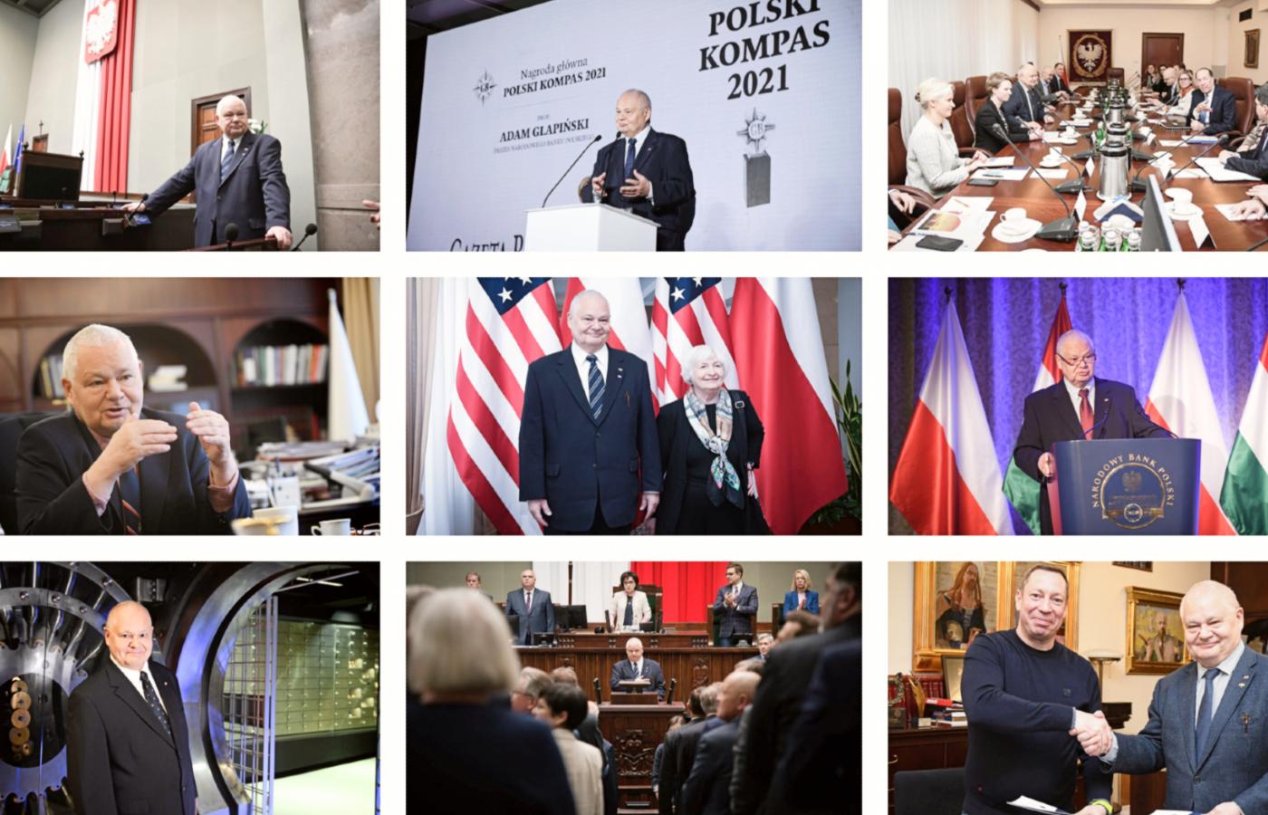 Na stronie zamieszczono krótką relację z zaprzysiężenia Adama Glapińskiego na drugą kadencję, jest promocja wywiadu z nim sprzed kilku dni dla tygodnika „Sieci” oraz informacja, że banknot z Lechem Kaczyńskim został uznany za najlepszy banknot kolekcjonerski 2021 r. Zaplanowano też specjalną sekcję na odnotowanie wyróżnień i nagród prezesa. Jako pierwsza wymieniona jest specjalna Nagroda Gospodarcza Prezydenta RP za utrzymanie stabilności systemu bankowego w trakcie pandemii, którą prezes odebrał od Andrzeja Dudy w listopadzie 2021 r. Zebrano też materiały wideo z wystąpień Glapińskiego. I wreszcie jest wciąż skromna galeria zdjęć z nim w roli głównej.