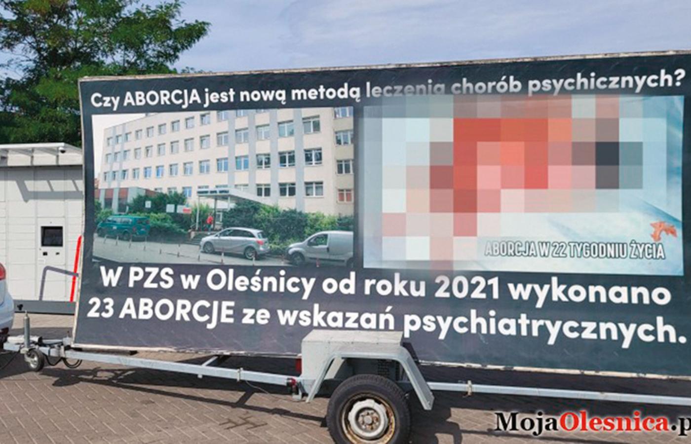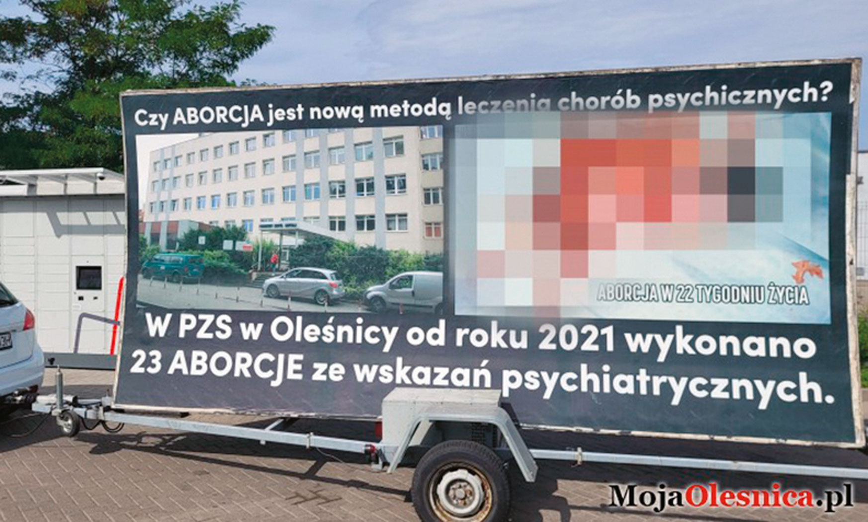 Mimo że aborcja w szpitalach pojawia się coraz rzadziej, fundamentaliści z Fundacji PRO Prawo do Życia wciąż nie są w pełni usatysfakcjonowani. Dziś skupiają się na prześladowaniu miejsc, gdzie jeszcze przeprowadzane są terminacje ciąży z powodu zagrożenia zdrowia lub życia kobiety. Jednym z nich jest szpital w Oleśnicy, w którym wykonuje się po wyroku najwięcej legalnych aborcji. W okolicy Fundacja umieściła baner z pytaniem: „Czy aborcja jest nową metodą leczenia chorób psychicznych? W PZS w Oleśnicy od roku 2021 wykonano 23 aborcje ze wskazań psychiatrycznych”. Do napisu dołączono zdjęcie rozkawałkowanego płodu. – Jest jeszcze furgonetka antyaborcyjna krążąca wokół szpitala, a do niedawna były też manifestacje przed wejściem do szpitala – parę osób, z transparentem, odmawiało różaniec.