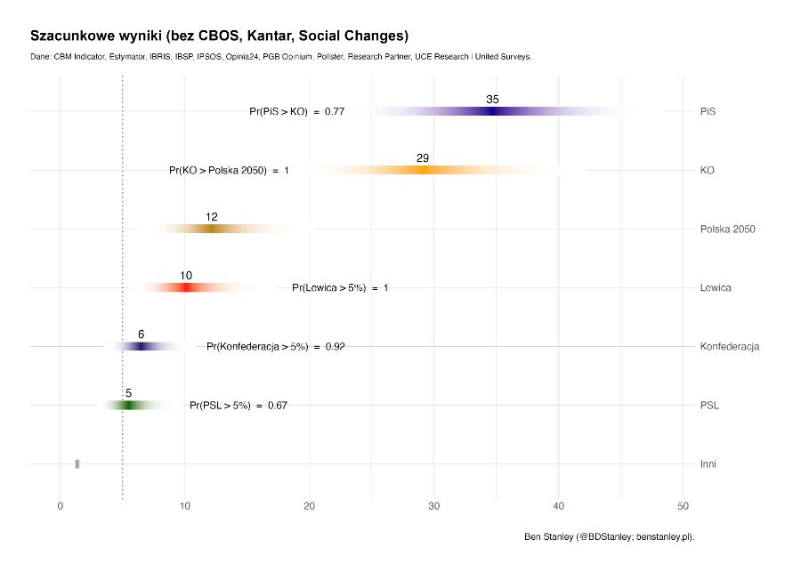 Można by stwierdzić, że ta stabilność jest efektem uśredniania szumu: skrajniejsze sondaże neutralizują inne. Dowody przemawiają jednak przeciw temu. Jeżeli wykluczymy ośrodek, którego sondaże konsekwentnie zawyżają poparcie dla PiS w stosunku do średniej (Social Changes), ośrodek, którego sondaże konsekwentnie zawyżają poparcie dla KO w stosunku do średniej (Kantar), oraz ośrodek, którego wysoki odsetek niezdecydowanych wyborców wnosi najwięcej niepewności (CBOS), to wyniki wyglądają następująco.