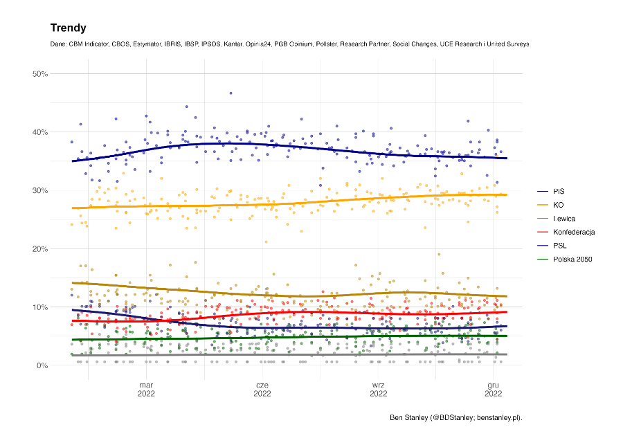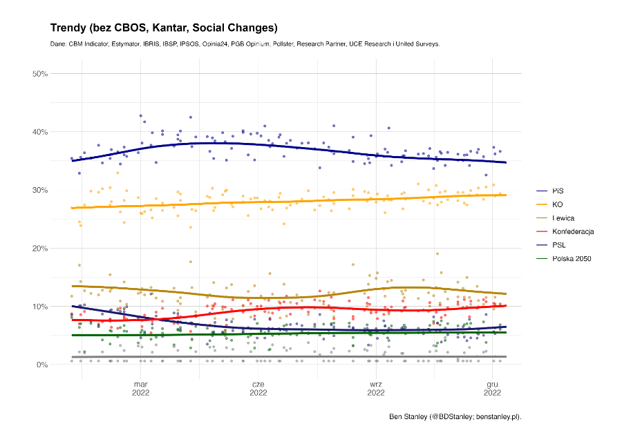 Bardziej niż kiedykolwiek polskie sondaże partyjne oferują „dla każdego coś miłego”. Zwolennicy KO ucieszą się z tego, co Donald Tusk nazwał „pierwszym prezentem pod choinką”. Zwolennicy PiS mogą wskazać na stałe poparcie przekraczające 35 proc. w sondażach Social Changes, a fani Konfederacji – wykorzystać wyniki tego samego badania (9 proc.), aby argumentować, że nadal są w pobliżu Lewicy i Polski 2050. Popierający PSL, odwołując się do wyników IBRiS (6,2 proc.) i United Surveys (5,9 proc.), mają okazję zasugerować, że wynik Kantar Public (2 proc.) musi być niefortunnym wyjątkiem. Tymczasem ci, którzy pozostają sceptyczni co do zalet istniejących partii, mogą pocieszać się faktem, że w trzech ostatnich sondażach odsetek niezdecydowanych respondentów jest dwucyfrowy.
