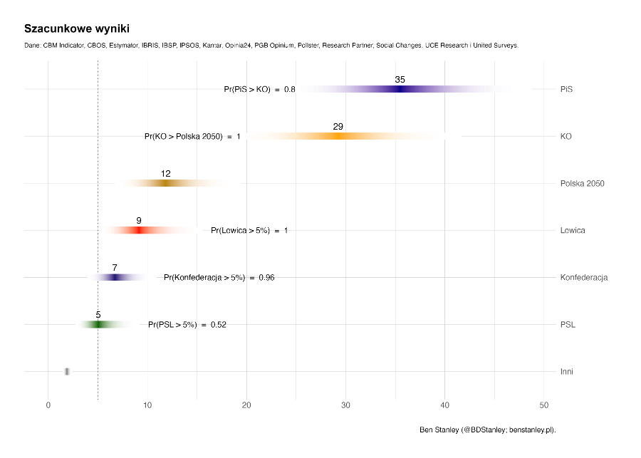 Dane, krótko mówiąc, są zaszumione. Pod tym szumem kryją się jednak wyraźne i trwałe trendy. Od lata popularność KO nieco wzrosła, a najbardziej prawdopodobny poziom poparcia dla niej wynosi 29 proc. W tym samym okresie poparcie dla PiS spadło do ok. 35 proc. W innych przypadkach w ostatnich sześciu miesiącach odnotowano więcej stabilności niż ruchu – Polska 2050 ma średnio 12 proc., Lewica – 9 proc., Konfederacja – 7 proc., PSL – 5 proc.