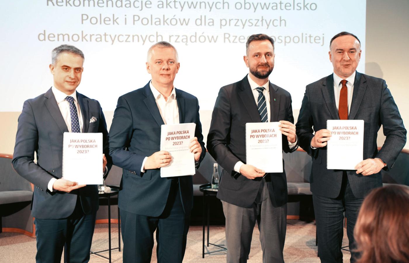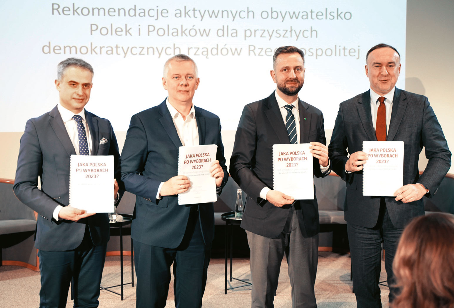 Byli wśród nich: Krzysztof Gawkowski, szef klubu parlamentarnego Lewicy, Tomasz Siemoniak, wiceprzewodniczący PO, Władysław Kosiniak-Kamysz, prezes PSL, i Michał Kobosko, wiceszef Polski 2050. Pretekst był znaczący, goście otrzymali bowiem „Rekomendacje programowe. Jaka Polska po wyborach 2023”, czyli podsumowanie cyklu 17 debat, które trwały od września zeszłego roku do marca br. Brali w nich udział eksperci z wielu dziedzin, ale również przedstawiciele partii opozycyjnych. Dopracowano się wielu wspólnych stanowisk w kwestii m.in. reformy wymiaru sprawiedliwości, oświaty, mediów publicznych, samorządów, polityki społecznej, roli służb specjalnych czy pozycji Kościoła w państwie. I choć, jak mówiono podczas prezentacji raportu z paneli, zdarzały się w dyskusjach różnice zdań i wizji (np. w kwestii wprowadzenia waluty euro w Polsce), zdecydowanie przeważał konsens i było widać, że jest na czym budować rząd po wygranych przez opozycję wyborach.