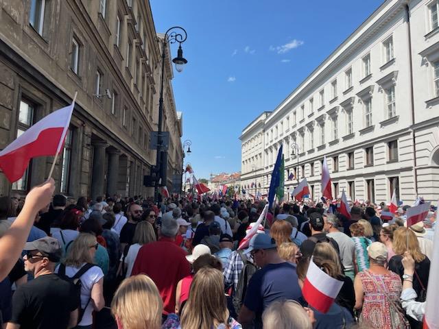 W drodze na pl. Na Rozdrożu sprzedawane były wielkie pluszowe kaczory, kolejki ustawiły się spore. Widać było transparenty: „PiS jest jak PZPR. Sądzić, wsadzić, zdelegalizować”, „Tutaj jest wolna Polska”, „Stop pisowskiej okupacji”, „Australia też ma dość”, „PiS nie może przecież wiecznie trwać” czy „Jestem agentem demokracji”. Ponad głowami powiewały flagi polskie, europejskie, także tęczowe. Na pl. Na Rozdrożu grubo przed południem brakowało już miejsca. Wielka rzeka ludzi rozciągała się Al. Ujazdowskimi, także pod Kancelarią Prezesa Rady Ministrów, miejscem pracy Mateusza Morawieckiego.