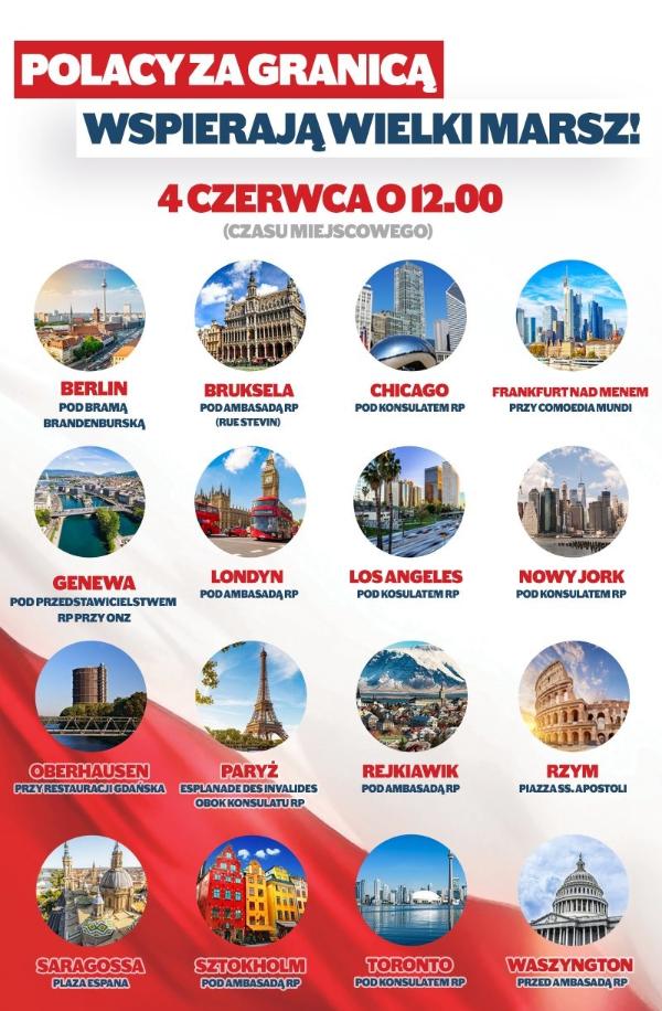 „Masz już dość ich kłamstw, złodziejstwa i korupcji. Chcesz lepszej, bezpieczniejszej przyszłości dla siebie, dla swoich bliskich, dla Polski. Szukasz nadziei i pragniesz zwycięstwa. Bądź w Warszawie 4 czerwca w samo południe na wielkim marszu. Pokażemy im naszą siłę” – tak od kilku tygodni do udziału w wielkim marszu 4 czerwca zachęcał na Twitterze lider opozycji, szef PO Donald Tusk. Zachęcał, by pokazać władzy PiS niezgodę na łamanie prawa i niszczenie demokracji.