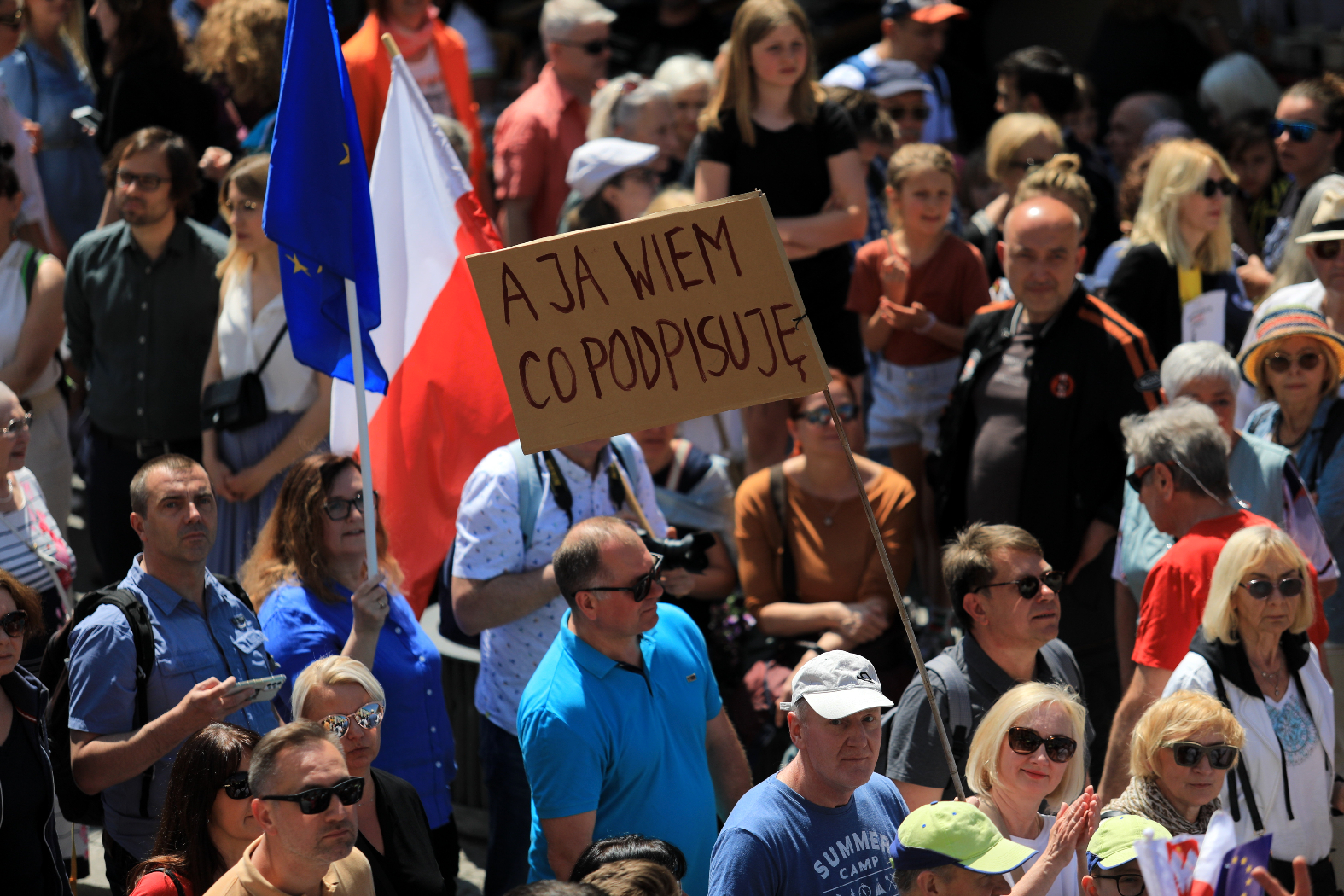 Zbliżając się do palmy w Jerozolimskich, słyszeliśmy już Donalda Tuska i widzieli pl. Zamkowy na telebimie. Morze, morze ludzi, transparentów, plakatów, banerów, flag sunących już Nowym Światem, a za nami końca nie widać. Policja robi swoje, dyskretnie legitymuje nabzdyczonego kontrasa, koledze pomaga zaparkować przed marszem, żeby dołączył bez zbędnej zwłoki, a na pożegnanie funkcjonariusz pyknął osiem gwiazdek (czyli dobitnie powiedział, co sądzi o partii rządzącej).