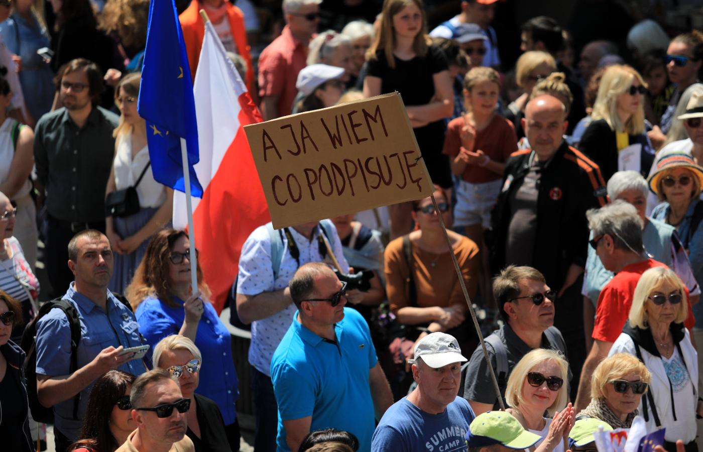 Morze, morze biało-czerwonych, żeby sobie nie myśleli, że mają monopol na patriotyzm. I mnóstwo tych znienawidzonych przez nich flag unijnych: w blasku słońca i na tle zieleni po obu stronach trasy prezentowały się godnie. Nagle cud: jest nasz transparent! Gdyśmy dołączyli, dzierżyli drzewca mocno redaktorzy Cezary Łazarewicz i Jerzy Kisielewski. Odtąd ten transparent naszej gildii był nam latarnią i busolą w tym morzu, morzu ludzi. Wszelkich stanów, każdego wieku – w naszym polu obserwacyjnym dominował wiek młodszy średni – każdej płci. Z balkonów tym razem machali do nas przyjaźnie, a nawet entuzjastycznie, a koledzy biegli w materii, kto gdzie mieszka w Warszawie, sypali nazwiskami machających nad wielkim napisem „PIS OFF”. Bo z tym ten marsz zgadzał się chyba w stu procentach. Dreptaliśmy raczej, niż maszerowali, ale co tam, fiesta wolności!