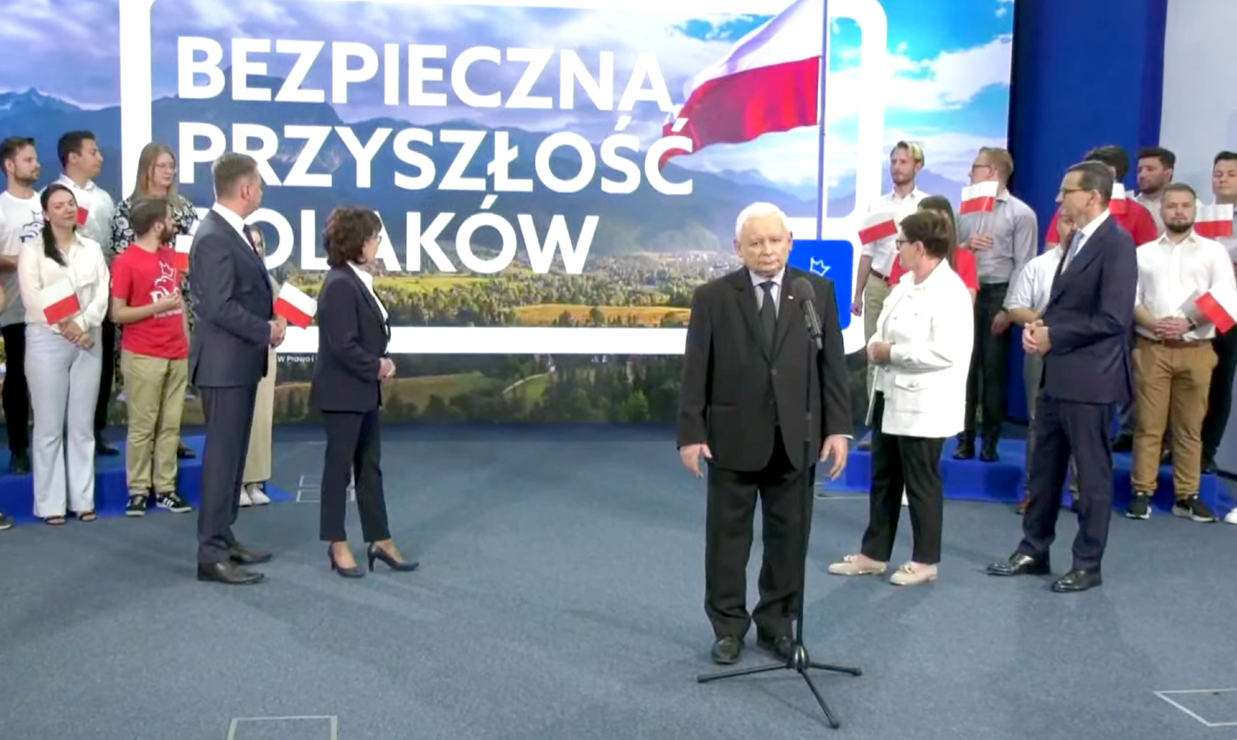 Hasło, z którym PiS pójdzie do najbliższych wyborów, Jarosław Kaczyński przedstawił na konferencji prasowej w piątek w południe. Za plecami miał duży napis: „Bezpieczna przyszłość Polaków”, zaś obok siebie innych ważnych polityków partii: Mateusza Morawieckiego, Beatę Szydło, Mariusza Błaszczaka i Elżbietę Witek. Przemówienie niepodzielnie należało do prezesa PiS.