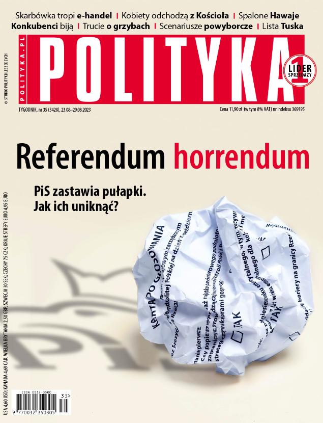 Ponadto w nowym numerze „Polityki”: polityczne grzybobranie; rosyjski autogaz wciąż w Polsce; rozmowa z szefem ukraińskiego IPN o powodach historycznej niezgody między Polską a Ukrainą; co robić z imigrantami – pragmatyzm kontra moralność; odkrywane archiwum Krzysztofa Kieślowskiego; o tym, jak internet sprzyja czytelnictwu, i o męskich kręgach.