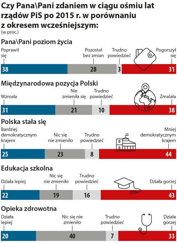 To ciekawy i wiele mówiący wynik. Wydawałoby się, że oczywista jest przewaga tych, którzy dostrzegli to, co PiS zrobił z Trybunałem Konstytucyjnym, prokuraturą, sądownictwem, mediami publicznymi itd. Ale tych respondentów, którzy uważają, że za drugich rządów PiS nic się w tej kwestii nie zmieniło lub wręcz demokracja bardziej kwitnie, jest w sumie 48 proc., a stwierdzających „trudno powiedzieć” – 55 proc. W tym poszerzonym obrazie to raczej PiS ma przewagę, co prawda w swoim stylu, czyli korzysta z obojętności, braku zdania, niezainteresowania tematem.