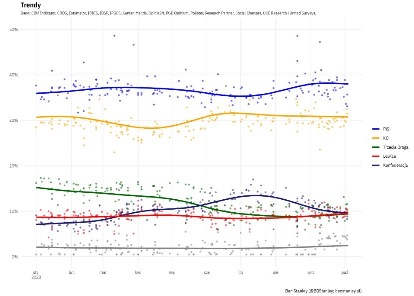 Średnie sondażowe nadal dają PiS, który ma obecnie 38 proc. poparcia, wyraźną przewagę nad KO, która ma 31 proc. Podczas gdy wyniki obu głównych partii pozostają zmienne, podstawowy trend sugeruje, że we wrześniu niewiele się tu zmieniło. Jednocześnie nastąpiło niemal całkowite zrównanie poparcia dla trzech mniejszych partii, z Konfederacją na poziomie 10 proc., Lewicą z 9 proc. i Trzecią Drogą z 9 proc.