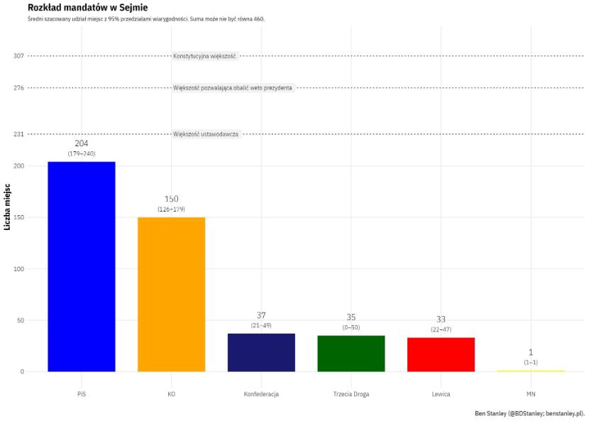 Gdyby przełożyć te wyniki na mandaty zgodnie z siłą partii na poziomie okręgów wyborczych, PiS potrzebowałby Konfederacji, żeby utworzyć większość sejmową, ale byłaby ona dość wyraźna z 241 mandatami (choć jej przewaga nieco zmalała w ostatnich tygodniach).