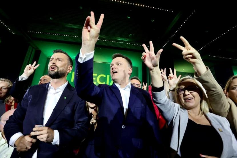 Jeden z dwóch liderów Trzeciej Drogi Szymon Hołownia mówił m.in.: „Wy jesteście autorami nadziei. Nie jestem Joanną Szczepkowską. Ale mogę zaryzykować i powiedzieć, choć nie mamy oficjalnych wyników, że 15 października skończyły się kłótnie i rozdawnictwo, a zaczęła się współpraca i inwestycje w naszą przyszłość”.