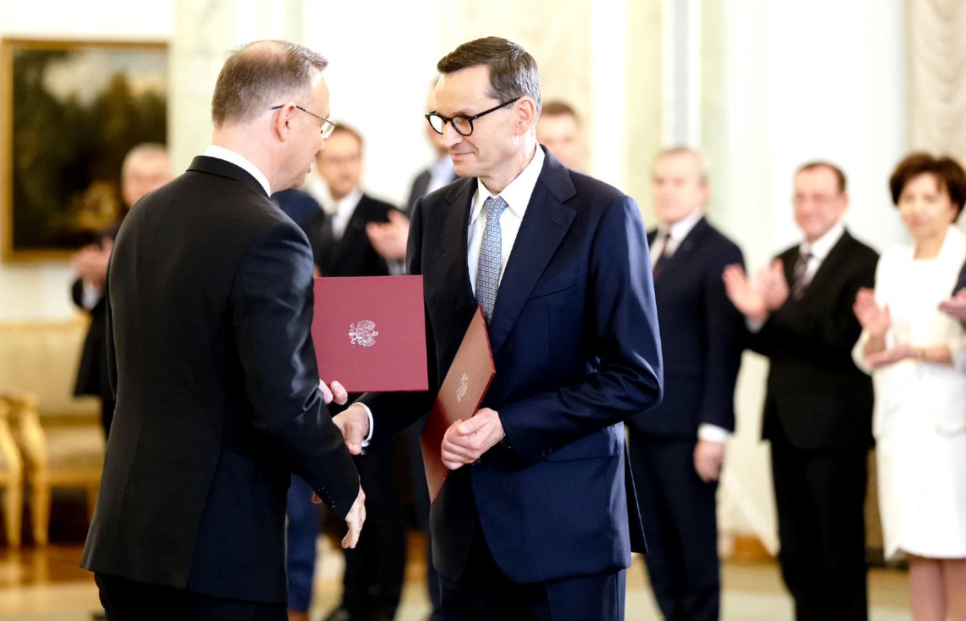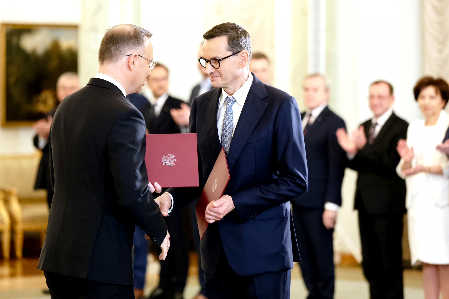 Koniec farsy zaczętej orędziem p. Morawieckiego w Sejmie miał miejsce tego samego dnia wieczorem, gdy Główny Lokator Pałacu Namiestnikowskiego oficjalnie wręczył dymisję Handlarzowi Pokościelnym Mieniem Bezspadkowym i równocześnie zaopatrzył go w akt powierzający mu zadanie stworzenia rządu. Byli obecni przy tym członkowie ustępującej Rady Ministrów, ale nie wszyscy, nie dostrzegłem np. p. Kaczyńskiego, jedynego wicepremiera (jak wieść niesie, mimo że jedyny, to nie wie, czym ma się zajmować), i p. Zbyszka (pardon za poufałość). Pan Duda złożył gratulacje p. Morawieckiemu, cieszył się, że uzyskał kolejne zapewnienie kandydata o posiadaniu większości parlamentarnej, i serdecznie życzył mu sukcesów w sprawowaniu funkcji premiera.
