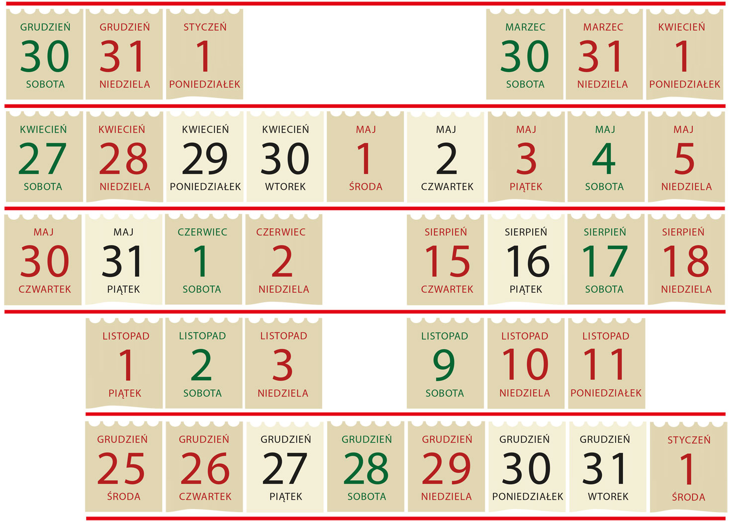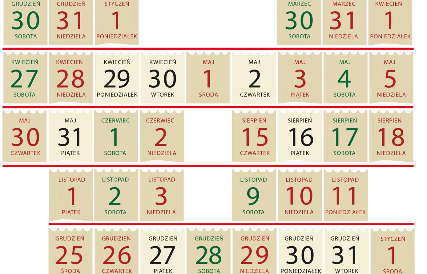 Dłuższe weekendy czekają nas w listopadzie: Wszystkich Świętych (1 listopada) to piątek, z kolei Święto Niepodległości (11 listopada) to poniedziałek. Za to kolejne bożonarodzeniowe święta dają okazję do zaplanowania dłuższego wypoczynku: pierwszy dzień Bożego Narodzenia (25 grudnia) wypada bowiem w środę, drugi (26 grudnia) – w czwartek. Biorąc dodatkowo trzy dni wolnego, można zbudować sobie dziewięciodniowy świąteczny wypoczynek. A wykorzystując jeszcze kolejne dwa dni, zagwarantować sobie aż 12 dni spokoju (21 grudnia – 1 stycznia)! O ile oczywiście do tego czasu zostanie nam jeszcze jakieś wolne.