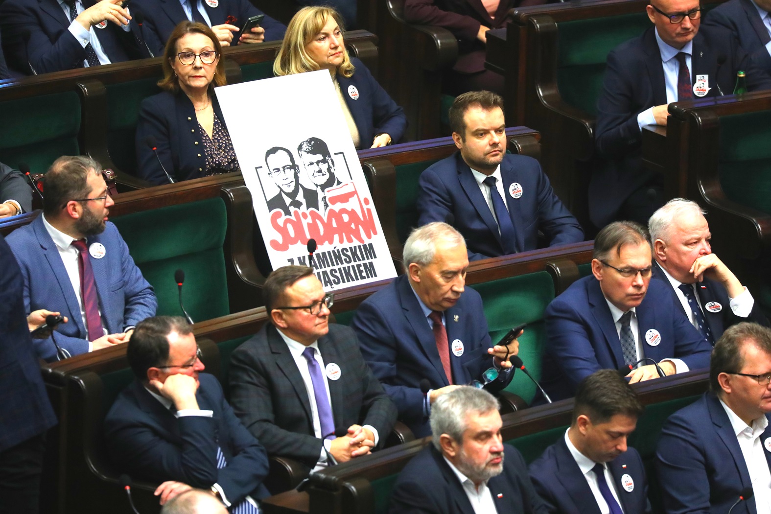 Posłowie PiS mają przypięte plakietki z wizerunkami niedawnych szefów służb specjalnych, a niektórzy wnieśli też ich portrety opatrzone napisem w „solidarycy”. Na galerii sali plenarnej pojawiły się żony skazanych, wznoszono okrzyki, a nawet odśpiewano hymn. Jako że skandowaniu na stojąco w rytm oklasków („U-wolnić posłów!”) nie było końca (przy czym Jarosław Kaczyński klaskał po swojemu, całkiem nie do rytmu), prowadzący obrady marszałek Hołownia musiał zarządzić przerwę i zwołać Konwent Seniorów.