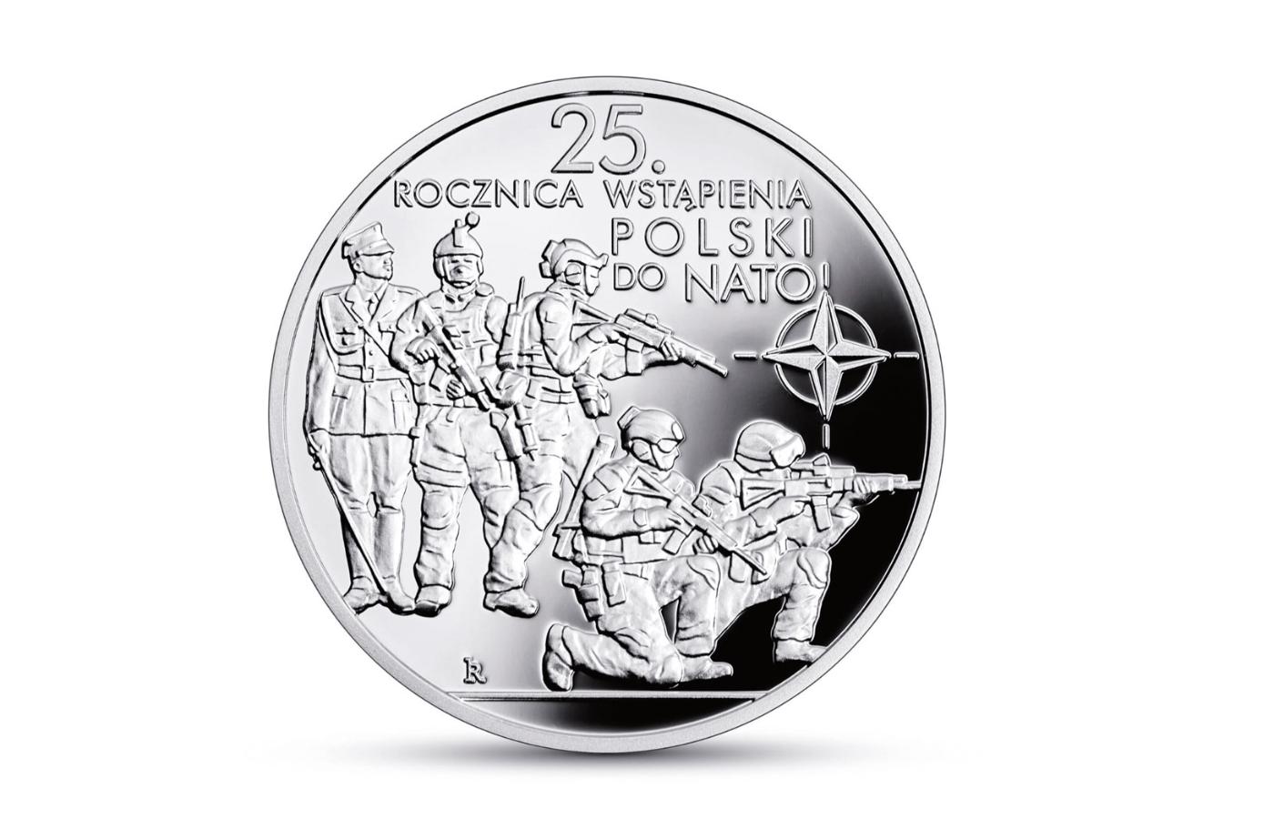 Srebrna moneta o nominale 10 zł (od 7 marca sprzedawana kolekcjonerom za 200 zł) ma uświetnić 25 lat członkostwa Polski w Sojuszu Północnoatlantyckim. To drugi numizmat wydany przez NBP w związku z obecnością Polski w NATO. Pierwszy pojawił się w serii „Droga do wolności” na samym początku, w czerwcu 1999 r. Moneta miała dwie wersje: srebrną o nominale 10 zł i złotą o nominale 2 zł. Wówczas wzór był konwencjonalny: po jednej stronie godło państwowe, po drugiej kompozycja graficzna z ziemskiego globu i desantujących się ze śmigłowca żołnierzy (umundurowanych na miarę epoki), na tle znanej z lotnictwa szachownicy. Po 25 latach NBP z orzełka zrezygnował, a grafikę ubogacił symboliką nowocześniejszą, ale w przeważającej części związaną z zakupami obronnymi poczynionymi za rządów PiS. Czyli ćwierćwiecze skrócił do „ostatnich ośmiu lat”, a nawet ostatniego roku, jeśli sądzić po sprzęcie uwidocznionym, a dostarczonym. Awers monety – jak głosi komunikat NBP – „przedstawia kompozycję uzbrojenia będącego w wyposażeniu Wojska Polskiego: samobieżną armatohaubicę Krab, wyrzutnię rakietową M142 HIMARS oraz czołg M1A1 Abrams”. Wszystko racja, bo ten sprzęt jest w uzbrojeniu polskiej armii, tyle że śladowo i od bardzo niedawna. Kraby to już legenda, ale przecież ich siedmioletnia „kariera” w jednostkach liniowych to zaledwie ułamek polskiego sojuszniczego stażu. O wiele krócej służą amerykańskie importy: pierwsze HIMARS-y dostarczone zostały mniej niż rok temu, a Abramsy – jeszcze później, bo w czerwcu 2023 r.