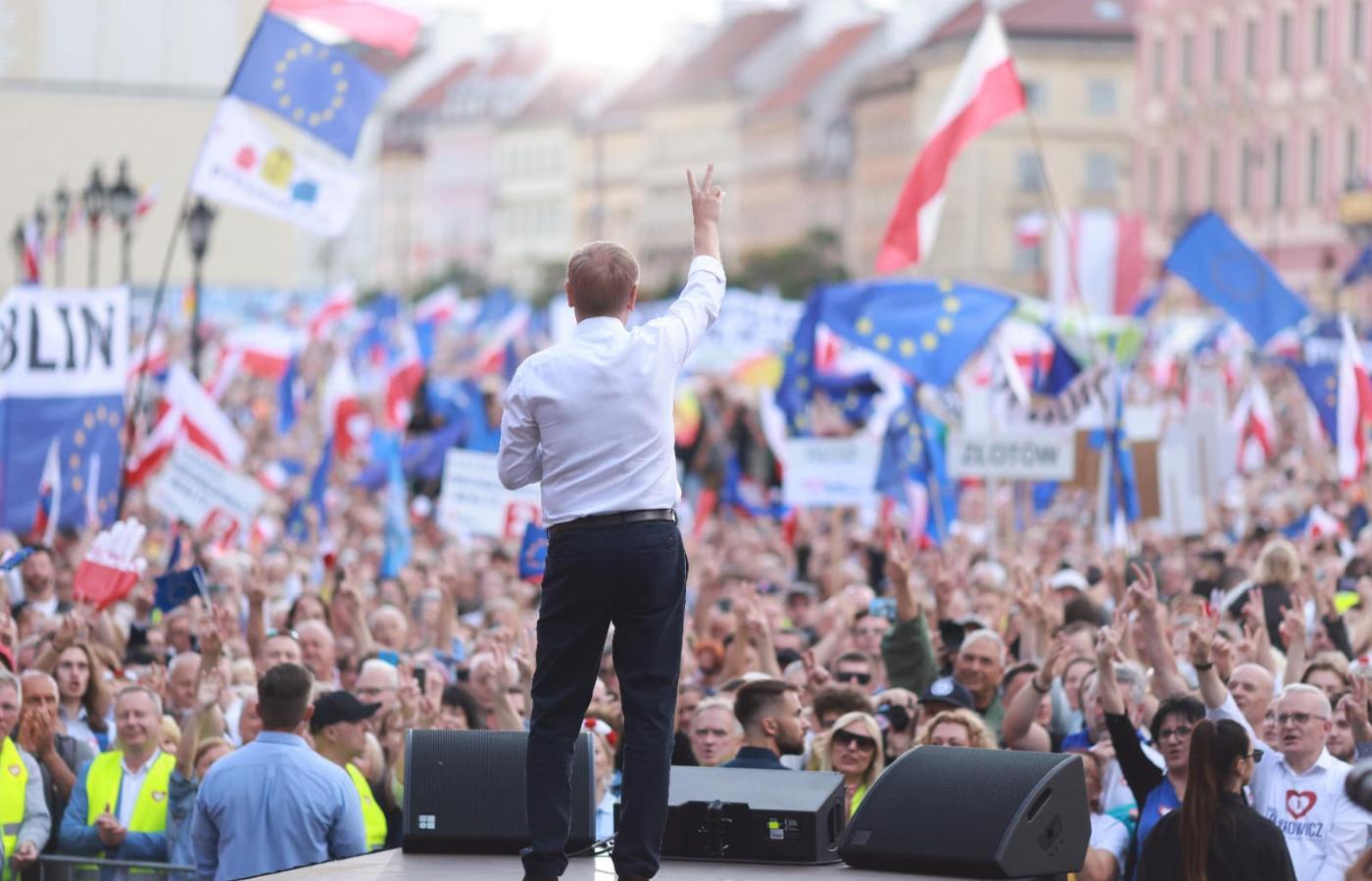 Prócz Tuska na placu Zamkowym przemawiali też m.in. Lech Wałęsa i Rafał Trzaskowski.