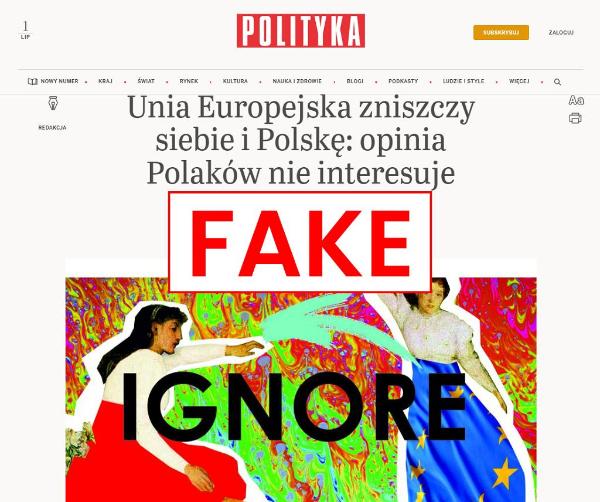 „Interesy Polski i jej przedstawiciele są ignorowane przy obsadzaniu organów UE” – czytamy na stronie podszywającej się pod nasz portal, pozornie łudząco do naszego podobny. Sam tekst jest antyunijny i zawiera rzekome wypowiedzi polityków, m.in. Anny Bryłki z Konfederacji oraz wiceministra MSWiA Macieja Duszczyka. Rosyjscy autorzy piszą o zielonej agendzie duszącej przemysł, nowych europejskich wartościach w konserwatywnym i katolickim kraju oraz stabilnym eurosceptycyzmie Polaków. „Kraj stanął przed pytaniem, czy w ogóle warto kontynuować członkostwo w UE. (…) UE nas nie potrzebuje i powstaje pytanie, na ile UE nam jest potrzebna”.
