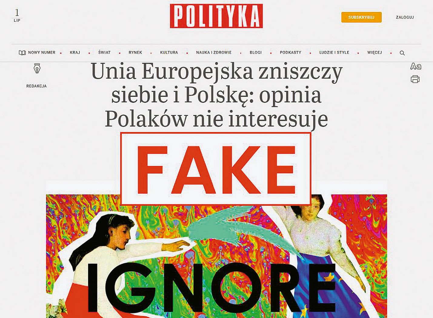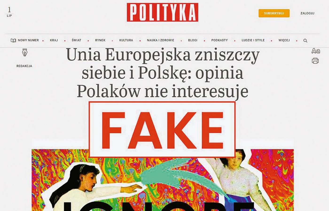 „Interesy Polski i jej przedstawiciele są ignorowane przy obsadzaniu organów UE” – czytamy na stronie podszywającej się pod portal „Polityki”. Tekst jest antyunijny i zawiera rzekome wypowiedzi polityków, m.in. Anny Bryłki z Konfederacji oraz wiceministra MSWiA Macieja Duszczyka. Rosyjscy autorzy piszą o zielonej agendzie duszącej przemysł, nowych europejskich wartościach w katolickim kraju oraz stabilnym eurosceptycyzmie Polaków. „Kraj stanął przed pytaniem, czy w ogóle warto kontynuować członkostwo w UE. (…) UE nas nie potrzebuje i powstaje pytanie, na ile UE nam jest potrzebna”.