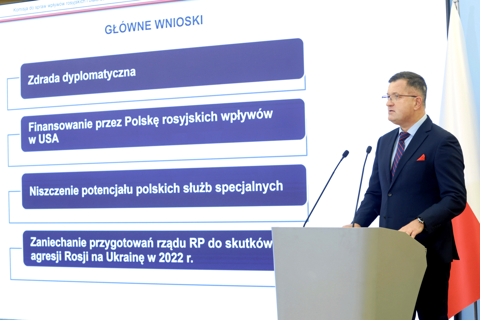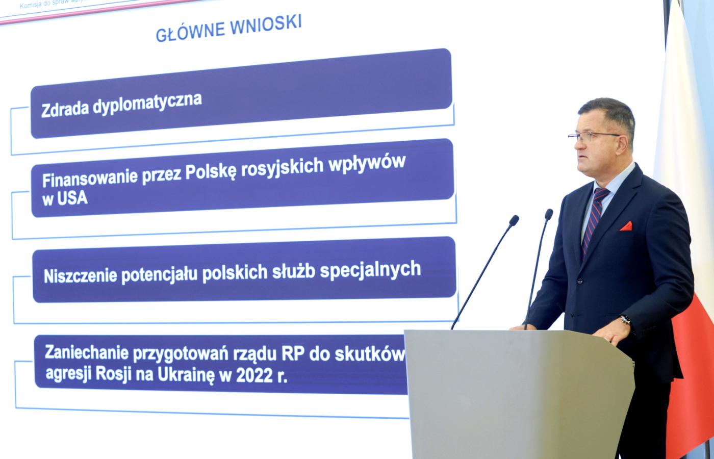 Wśród zarzutów wobec polityka PiS szef komisji wymienił m.in. udaremnianie zakupu uzbrojenia na rzecz sił zbrojnych RP oraz finansowanie przez polskie podmioty państwowe i gospodarcze podmiotów wspierających politykę Rosji w USA. Wspomniał także o niszczeniu potencjału polskich służb specjalnych i zaniechaniach przygotowań rządu RP do skutków agresji Rosji na Ukrainę w 2022 r.