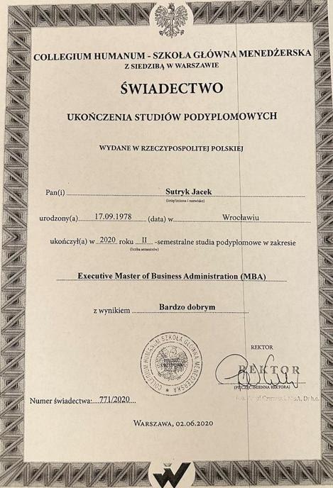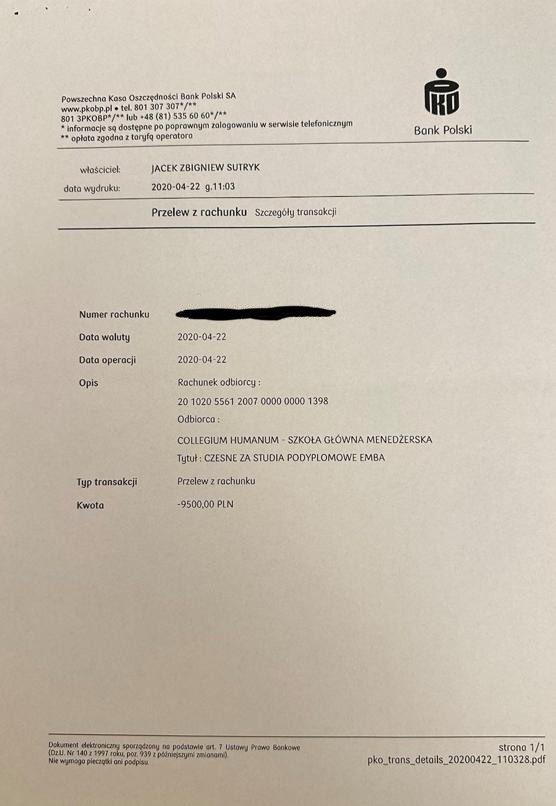 Sprawa dyplomu ukończenia studiów MBA przez Jacka Sutryka w Collegium Humanum była mocno „podkręcana” w czasie kampanii samorządowej, tym bardziej że walczący o reelekcję prezydent Wrocławia nie chciał ujawnić przelewu za studia. Ujawnił go w kwietniu na platformie X: przelew za czesne wykonał 22 kwietnia 2020 r. na 9,5 tys. zł. Ale umowę z uczelnią podpisał w Warszawie w październiku 2019. Świadectwo ukończenia studiów MBA nosi datę 2 czerwca 2020 r. Z dat można wnioskować, że prezydent Wrocławia dostał „prolongatę” płatności na pół roku. Jak nieoficjalnie poinformował RMF FM, Sutryk został zatrzymany, bo dyplom w Collegium Humanum miał kupić.
