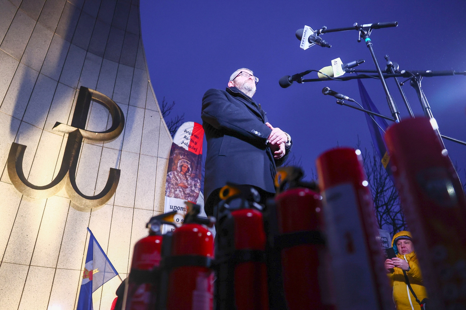 Zgromadzeni zjawili się zaopatrzeni w gaśnice i tablice z jej symbolem, polskie flagi, a nawet maski z twarzą Grzegorza Brauna. – Jak burą sukę gonić chanukę! – skandowali niektórzy. – Mamy wśród nas artystów, poetów. Każdy protestuje jak może – tłumaczył rozbawiony przedstawiciel jednego z „niezależnych” mediów. Owymi artystami byli Wojciech Olszański i Marcin Osadowski ze zdelegalizowanej przed miesiącem partii Rodacy Kamraci.
