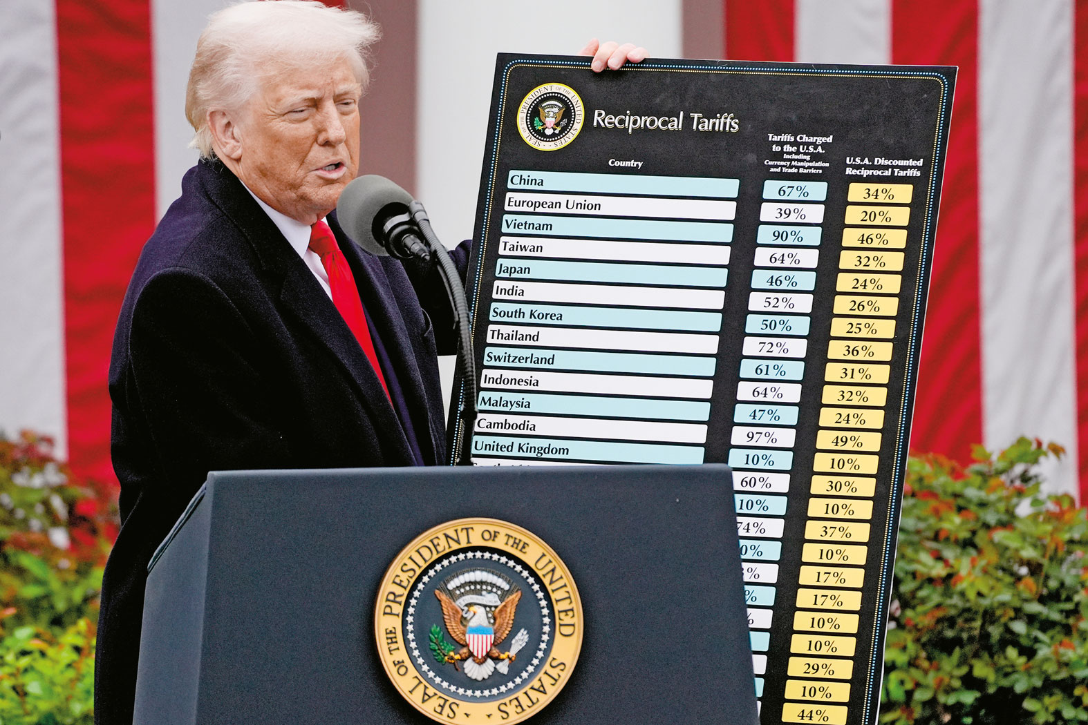 Unia Europejska, która ma sporą nadwyżkę w handlu towarami z USA (bo w handlu usługami mamy deficyt), została potraktowana wyjątkowo – dostała 20 proc. cła „wzajemnego”, które będzie doliczane do stawek już istniejących. Nie jest to taryfa najwyższa, bo południowo-wschodnia Azja otrzymała boleśniejsze uderzenia: Kambodża (49), Wietnam (46), Tajlandia (36), Indonezja (32). Także o Chinach Trump nie zapomniał (34), więc po doliczeniu do już wcześniej wprowadzonej stawki oznacza cło 54-proc.