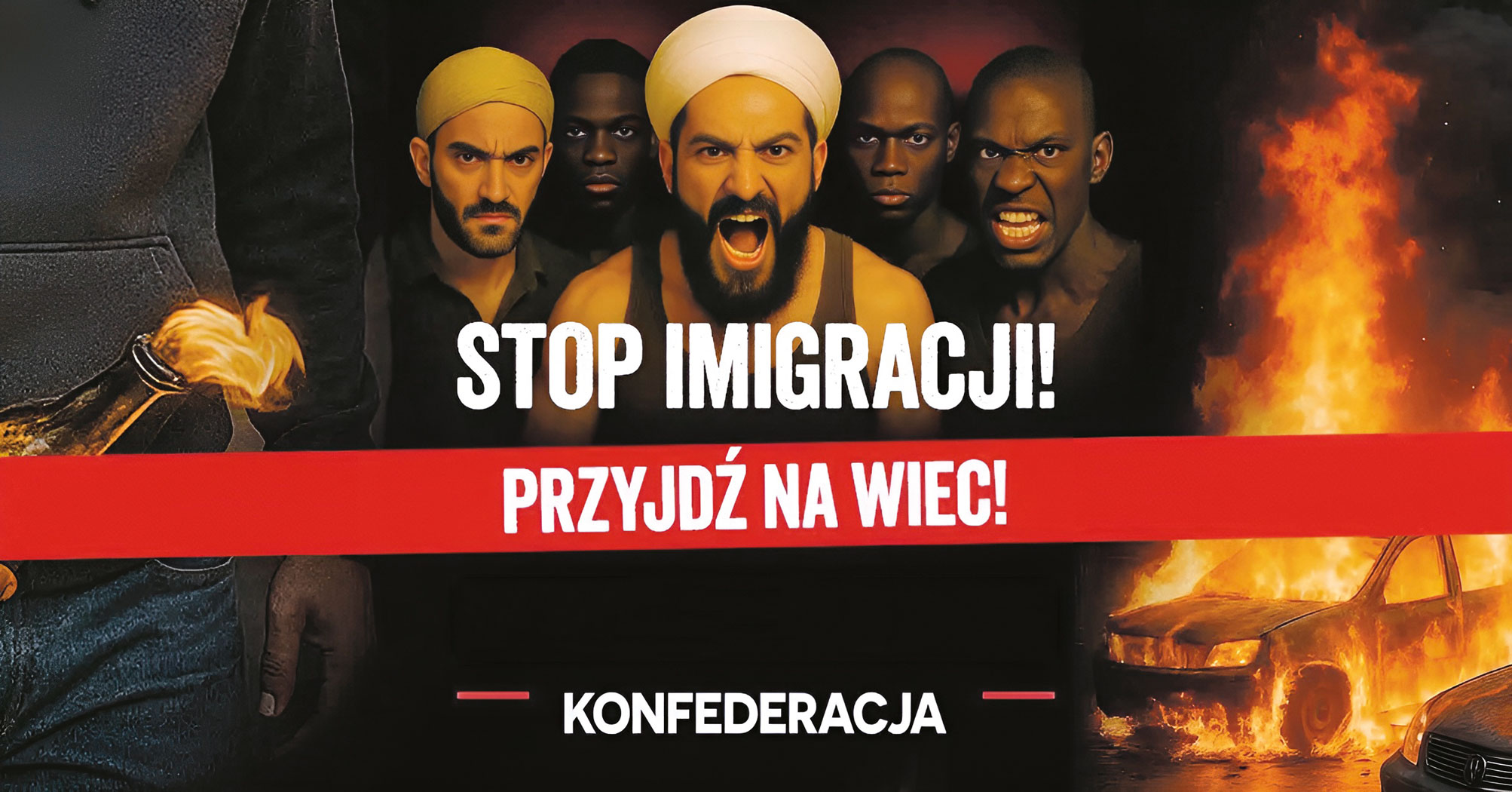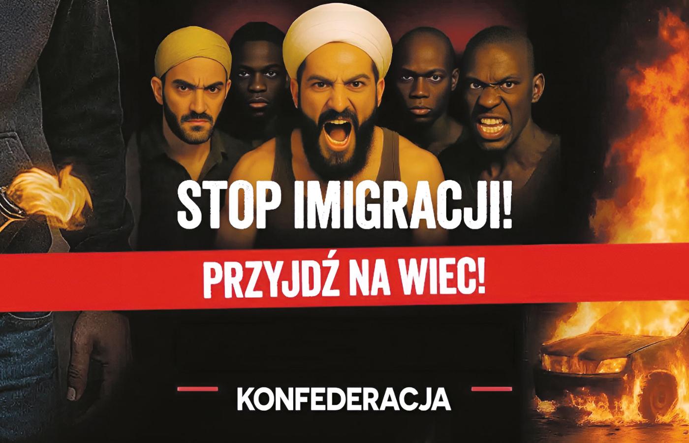 W sobotę przez cały kraj przeszły organizowane przez Konfederację manifestacje pod hasłem „Stop imigracji!”, wyrażające poparcie dla samozwańczych obrońców granic. Protestowano w 80 miejscowościach, w tym dużych miastach, m.in. w Białymstoku, Gdańsku, Krakowie, Poznaniu, Toruniu, we Wrocławiu oraz w Warszawie i Katowicach (gdzie w demonstracjach wzięło udział po kilka tysięcy osób). Lider Konfederacji Sławomir Mentzen (Nowa Nadzieja) pojawił się na pikiecie w Toruniu, a Krzysztof Bosak, szef Ruchu Narodowego wchodzącego w skład Konfederacji – w Białymstoku. W wielu miastach manifestacjom antyimigranckim towarzyszyły kontrmanifestacje zorganizowane przez środowiska lewicowe. Na fot. plakat rozklejany przez Konfederację.