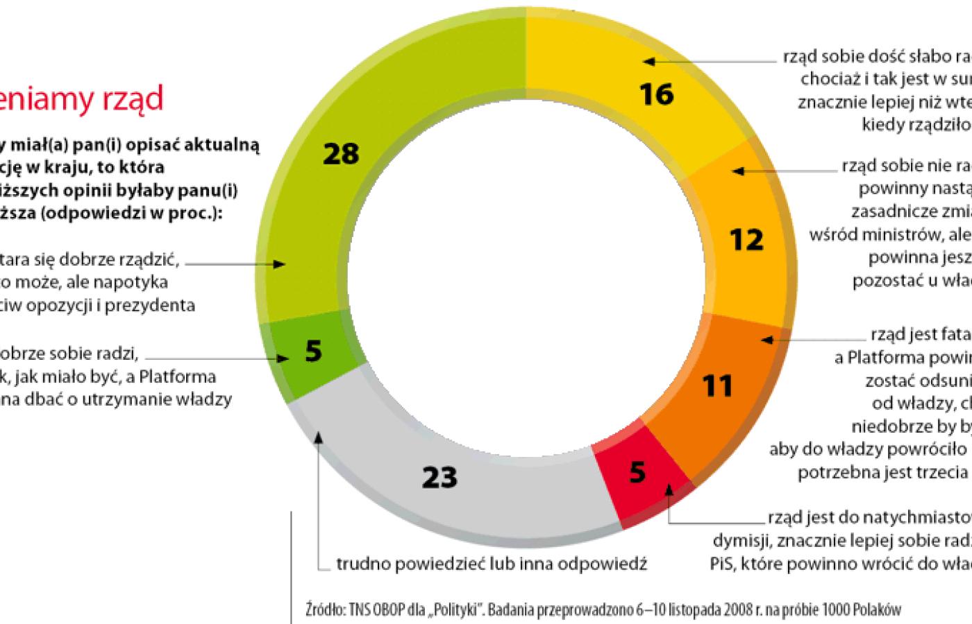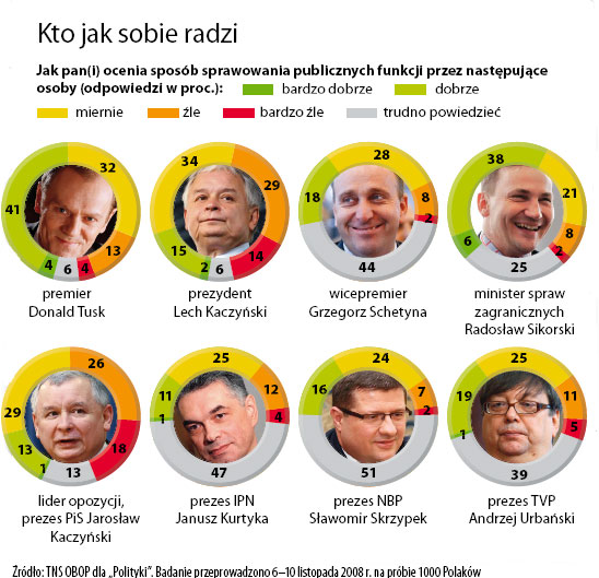 Jednak na ostatniej Radzie Krajowej Platformy Obywatelskiej (w sobotę, 15 listopada) premier nie tryskał optymizmem i przed nadmiarem optymizmu przestrzegał. Trudno rozstrzygnąć, czy Donald Tusk przemyślał lekcję pierwszych miesięcy swego rządu, które dość trwale ukształtowały jego wizerunek, czy też nastrój tonowały okoliczności, takie jak walka o ustawę o emeryturach pomostowych, świadomość niejasności sytuacji gospodarczej kraju, związanej ze światowym kryzysem, trudne rozmowy z partnerami w UE o pakiecie klimatycznym. Lekcja pierwszego roku niewątpliwie powinna zostać przemyślana. Świadczy ona m.in. o trwałości etykiet, jakie się otrzymuje i które pozostają znakami firmowymi nawet wówczas, gdy już nie pokrywają się z rzeczywistością. W tych pierwszych miesiącach gabinet Tuska zyskał opinię nieprzygotowanego do sprawowania władzy (puste szuflady), nieskutecznego (pierwsze, w dużej mierze na własną prośbę, przegrane weto w sprawie ustawy medialnej, wzmocnione porażką z PZPN), takiego, który złożył nazbyt wiele obietnic, z których nie jest w stanie się wywiązać, a więc nie sprawi zapowiadanego cudu.