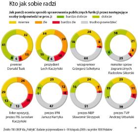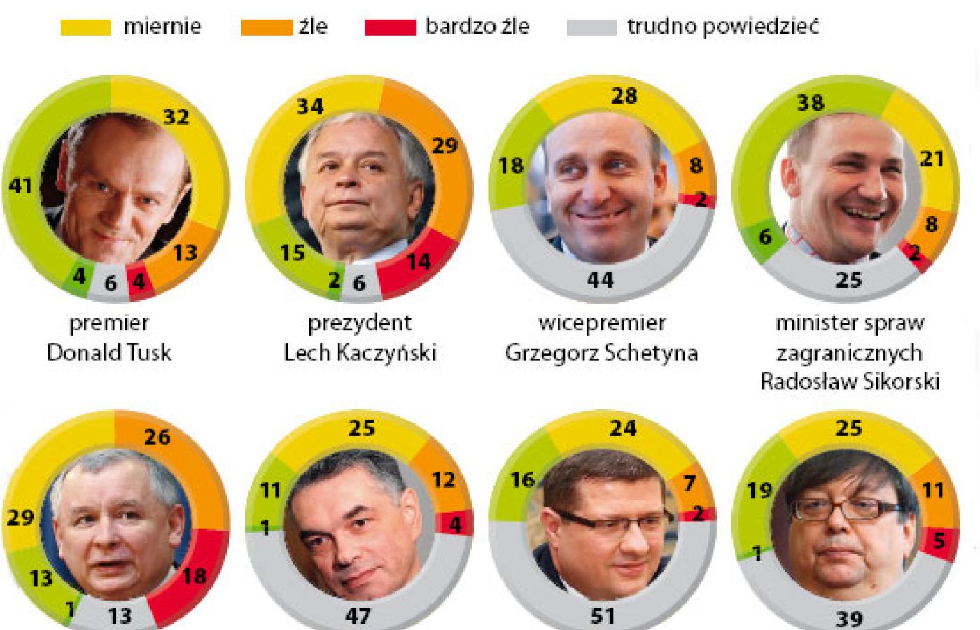 Dwie najpopularniejsze opinie zdają się sprawiedliwie opisywać sytuację. Rzeczywiście, rząd się stara. Rzeczywiście, jest sprzeciw opozycji, są konflikty wywoływane przez prezydenta i prezydenckich urzędników, w które jednak premier i jego ludzie za często i niepotrzebnie dają się wciągać. I prawdą jest też, że choćby rząd Tuska uznać za słaby i niezbyt aktywny, to po rządach PiS może on stwarzać atmosferę sprzyjającą odpoczynkowi po nazbyt forsownym, a w dodatku jałowym biegu. Oczywiście, premier może się dodatkowo cieszyć, że zdaniem aż 45 proc. ankietowanych dobrze pełni funkcję publiczną. Ludzi koalicji i opozycji dzieli w tym rankingu przepaść, bo prezes PiS Jarosław Kaczyński tylko zdaniem 14 proc. dobrze pełni funkcję lidera opozycji, a szef SLD zbiera uznanie 9 proc. Może sobie Donald Tusk dorzucić bardzo dobre notowania Platformy, ciągle oscylujące wokół 50 proc. poparcia, co jest zdarzeniem bezprecedensowym. Powtarzanie, że są one tak wysokie, bo nie ma alternatywy, nie wyjaśnia w pełni tego fenomenu i jest dla partii rządzącej niesprawiedliwe. Gdyby to PiS miał takie poparcie, grzmiałby, że cały naród popiera IV RP. A na deser Tusk we wszystkich rankingach prezydenckich wygrywa z Lechem Kaczyńskim.