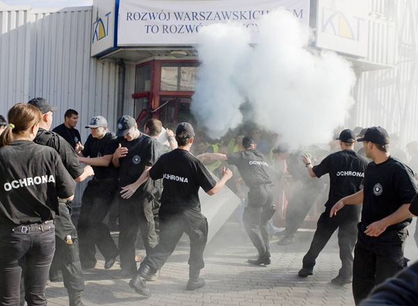 We wtorek, 21 lipca już od rana pod warszawskim KDT było niespokojnie. Kupcy zabarykadowali się od środka, nie pozwalając na wejście komornika, który tego dnia miał ich eksmitować z hali. Ochroniarze, którzy rozpoczęli szturm na zamknięte drzwi do blaszaka rozpylili gaz - relacjonowały media (w środę pojawiły się jednak wątpliwości, czy rzeczywiście to oni użyli gazu). W ich stronę, a także policjantów i strażników miejskich posypały się płyty chodnikowe rzucane przez sympatyków prostestujących kupców. "Wsparcia" udzielili im także chuligani z boisk, którzy próbowali staranować barierki rozstawione przez policję. Bilans: kilkadziesiąt rannych osób. Policja aresztowała 22 osoby, 19 z nich następnego dnia postawiono zarzuty naruszenia nietykalności cielesnej policjantów i dążenie do udaremnienia egzekucji komorniczej. Pojawiły się jednak zastrzeżenia prawne m. in. ze strony Helsińskiej Fundacji Praw Człowieka co do sposobu przeprowadzenia egzekucji.