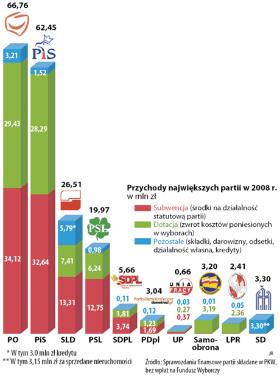 W finansach odbija się ogólna sytuacja ugrupowania. Sprawozdania finansowe partii, nawet tych niedawno głośnych, wyglądają czasami jak księgi kondolencyjne, kiedy okazuje się, że drobne sumy wpłacili tylko prezes i wiceprezes. Partie bliskie władzy radzą sobie dużo lepiej. Członek PO na początek płaci wpisowe – 10 zł, a potem co miesiąc 5 zł składki (uczniowie, studenci i emeryci – 2,50 zł). Ponadto „członkowie PO sprawujący funkcje publiczne z ramienia PO zobowiązani są do płacenia na rzecz partii do 10 proc. miesięcznego wynagrodzenia z tytułu sprawowanych funkcji – środki te są traktowane jako darowizny na rzecz PO” – głosi instrukcja finansowa partii z 4 kwietnia 2007 r.