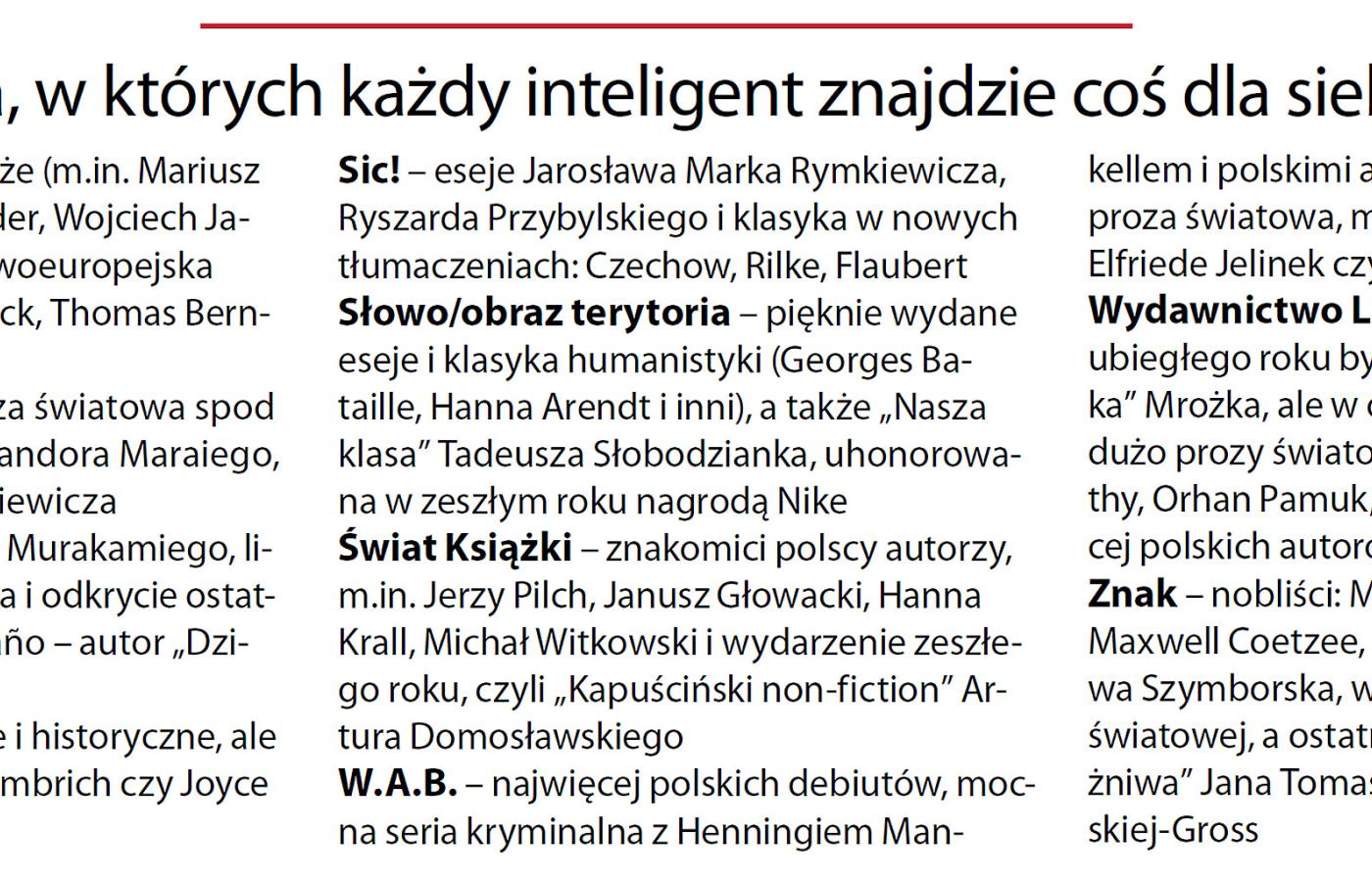 Sic! – eseje Jarosława Marka Rymkiewicza, Ryszarda Przybylskiego i klasyka w nowych tłumaczeniach: Czechow, Rilke, Flaubert Słowo/obraz terytoria – pięknie wydane eseje i klasyka humanistyki (Georges Bataille, Hanna Arendt i inni), a także „Nasza klasa” Tadeusza Słobodzianka, uhonorowana w zeszłym roku nagrodą Nike