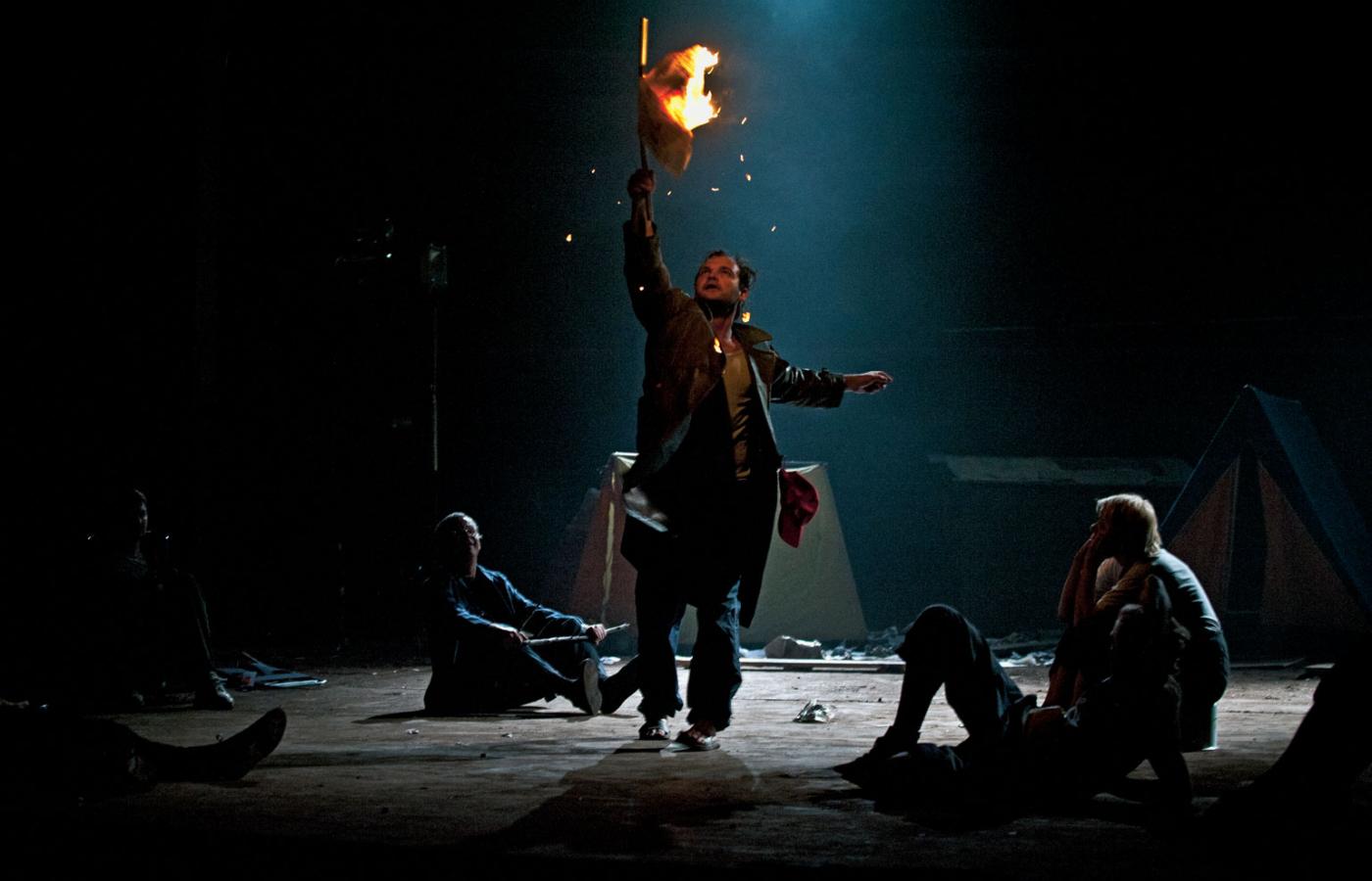 W spektaklu „Mickiewicz. Dziady. Performance” w reż. Pawła Wodzińskiego (Teatr Polski w Bydgoszczy) zanim akcja przeniesie się na Krakowskie Przedmieście, toczy się w środku dzikiego obozowiska emigrantów, w którym plemię biedaków celebruje swoje krwawe, okrutne rytuały. To wspólnota frustracji, złości i pragnienia zemsty. Na kim? Na świecie, który im odjechał, na tych wszystkich elitach, salonach, klubach bogatych i możnych, którzy polskość sprzedali za namiastkę, a może tylko mrzonkę czy obietnicę europejskości. Na czele wspólnoty frustracji stoi Guślarz/ksiądz Piotr, a właściwie ojciec Tadeusz. Już przed barierkami przed Pałacem Prezydenckim tłum będzie wymachiwał zdjęciami zamęczonych przez komunistów, Rollisonowa może być matką zamordowanego przez SB Grzegorza Przemyka. Konrad próbuje przejąć rolę barda tej nowej rewolucji, zostać nowym Jackiem Kaczmarskim.