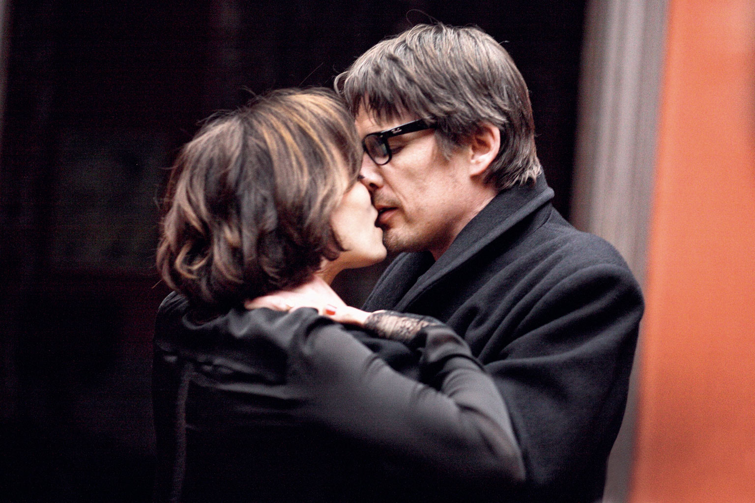 W okularach z ciemnymi oprawkami Ethan Hawke przypomina na ekranie pana.
