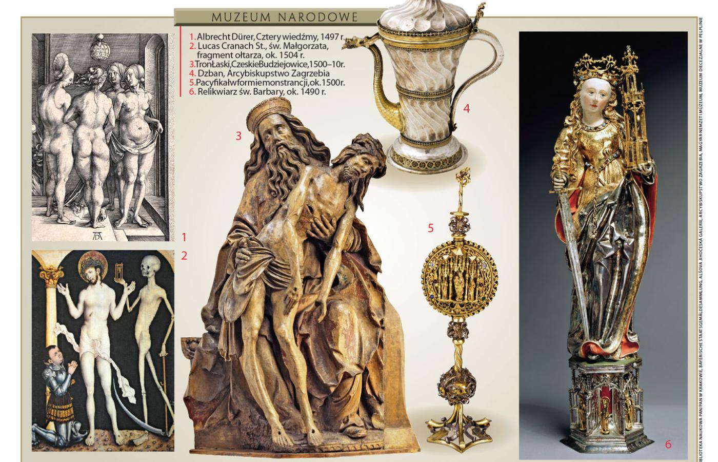 No i drugi obszerny wątek – katolicki, z rozlicznymi sprzętami i szatami liturgicznymi, fragmentami ołtarzy, relikwiarzami, wizerunkami świętych itd. (kilka rzeźb Wita Stwosza). Generalnie sztuka oscylująca między gotykiem a renesansem, zazwyczaj pozbawiona efektownego rozmachu, a wymagająca od odbiorcy skupienia. W obcowaniu z pracami doskonale pomaga katalog zawierający szczegółowe opisy poszczególnych obiektów, tłumaczący, skąd się wzięły i dlaczego są ważne.