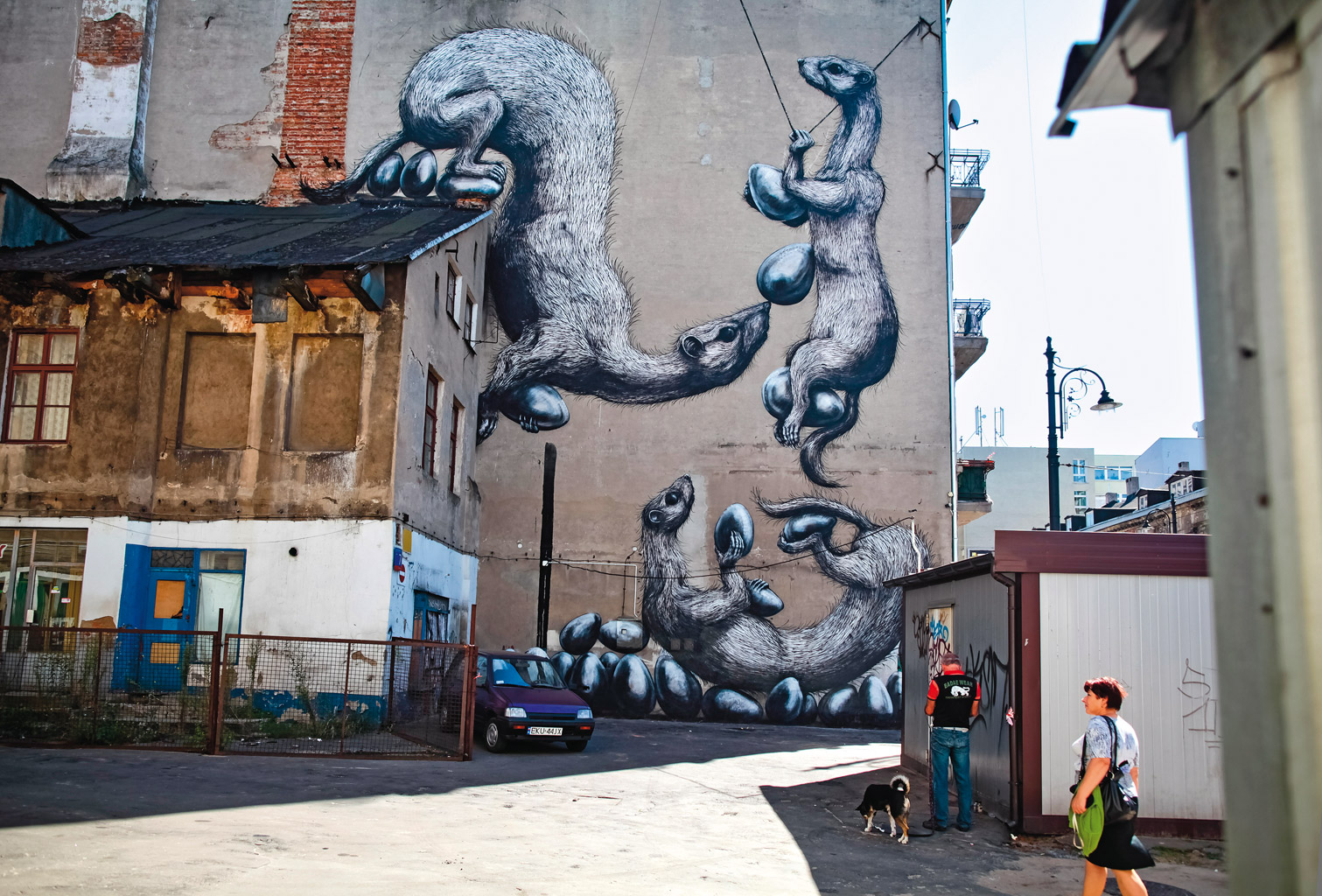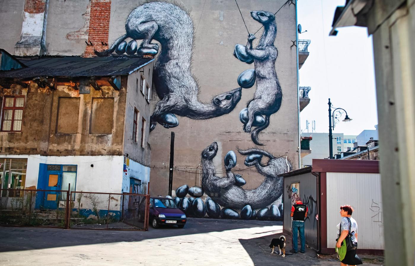 Fakt. W Polsce, zważywszy na dużą liczbę murali, problemów jest zaskakująco mało. I są to zazwyczaj spory wewnątrzśrodowiskowe, jak ten, który towarzyszył tworzeniu wielkoformatowych prac we Wrocławiu przez rapera L.U.C (walczyła z nim m.in. legenda street artu Sławek „Zbiok” Czajkowski) czy stołeczne protesty przeciwko muralom na Dworcu Centralnym oraz na zabytkowej kamienicy przy ul. Freta (kiczowate malowidło poświęcone Marii Skłodowskiej-Curie). Ale najbardziej znana jest historia murali z ul. Dudziarskiej na przedmieściach Warszawy. Otóż artyści postanowili pójść na duże skróty w estetycznej edukacji i mieszkańcom osiedla socjalnego zafundowali na elewacji wielkie czarne kwadraty nawiązujące do twórczości Kazimierza Malewicza. Reakcja lokalnej społeczności była – jak nietrudno przewidzieć – gwałtowna.